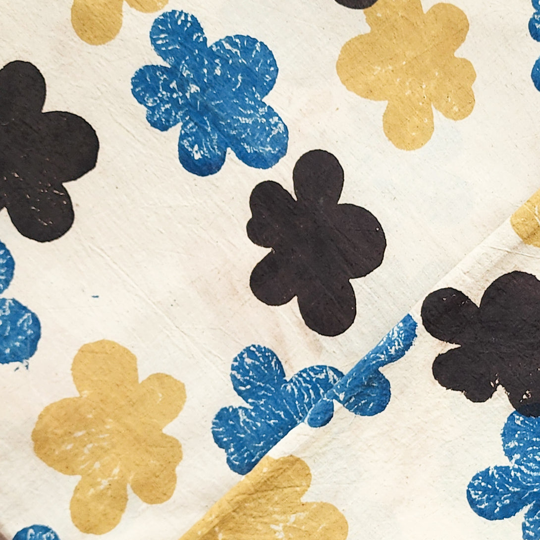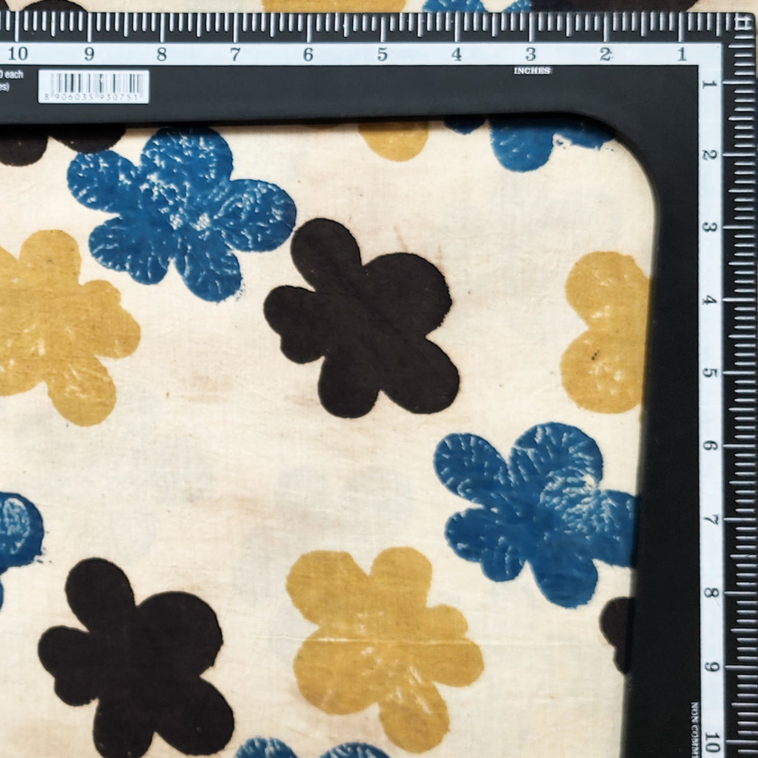Pure Cotton Ajrak Cream With Blue And Mustard Flower Motif Hand Block Print Fabric