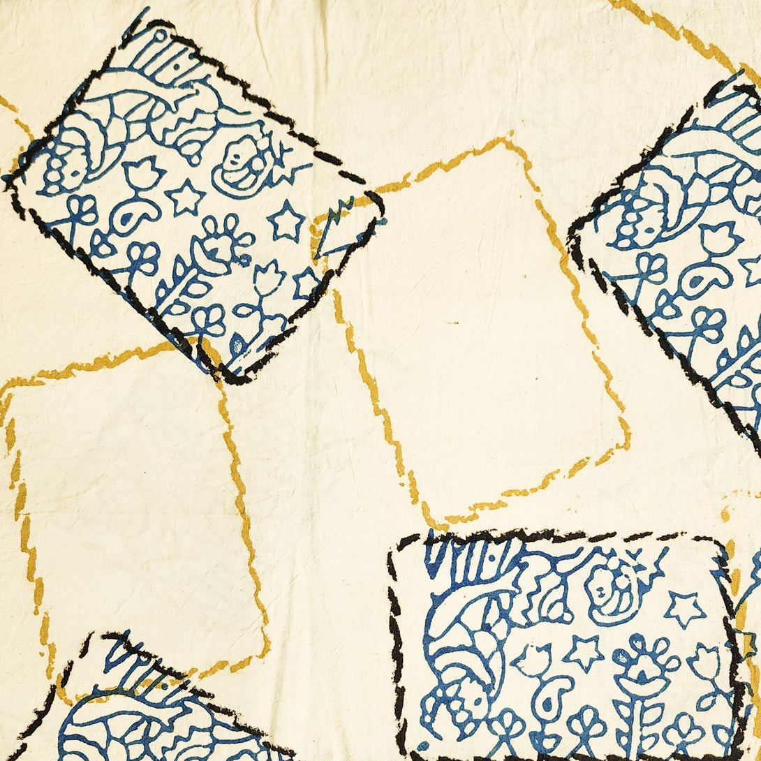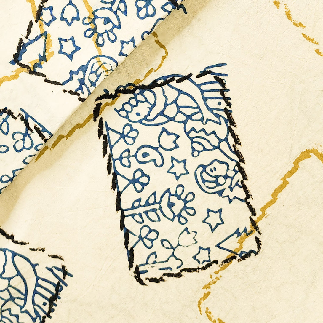 Pure Cotton Ajrak Cream With Blue Photo Frames Design Hand Block Print Fabric