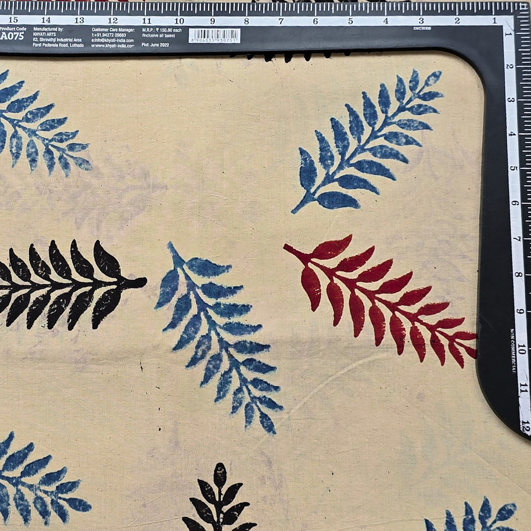 Pure Cotton Ajrak Cream With Blue Red And Black Leaves Hand Block Print Fabric