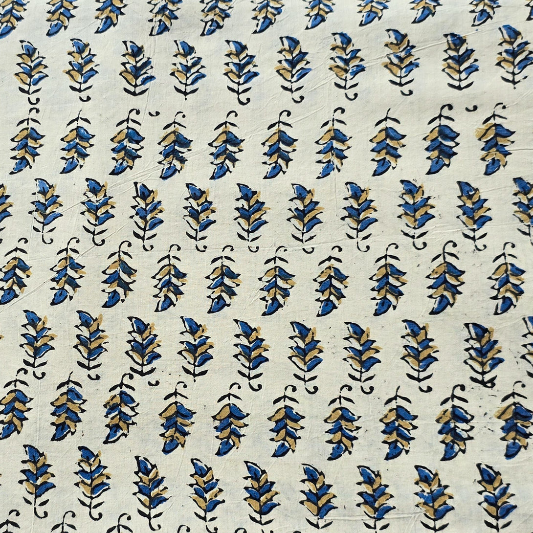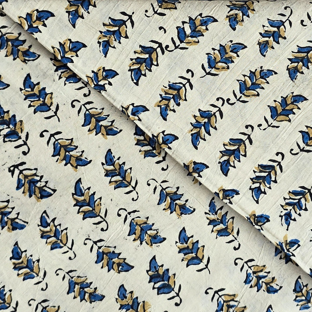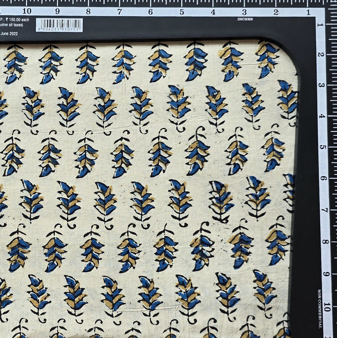 Pure Cotton Ajrak Cream With Blue Small Leaves Motif Hand Block Print Fabric