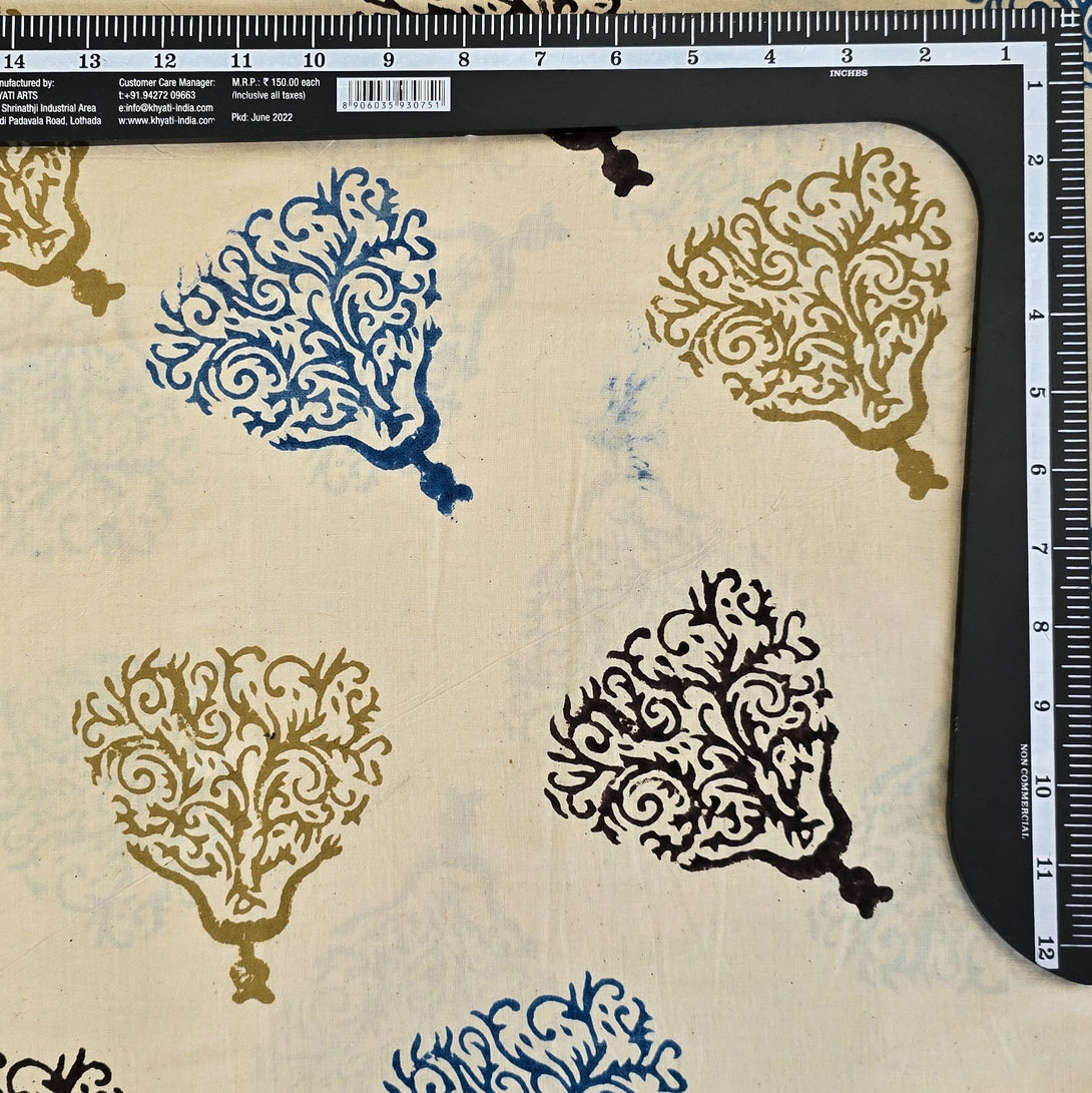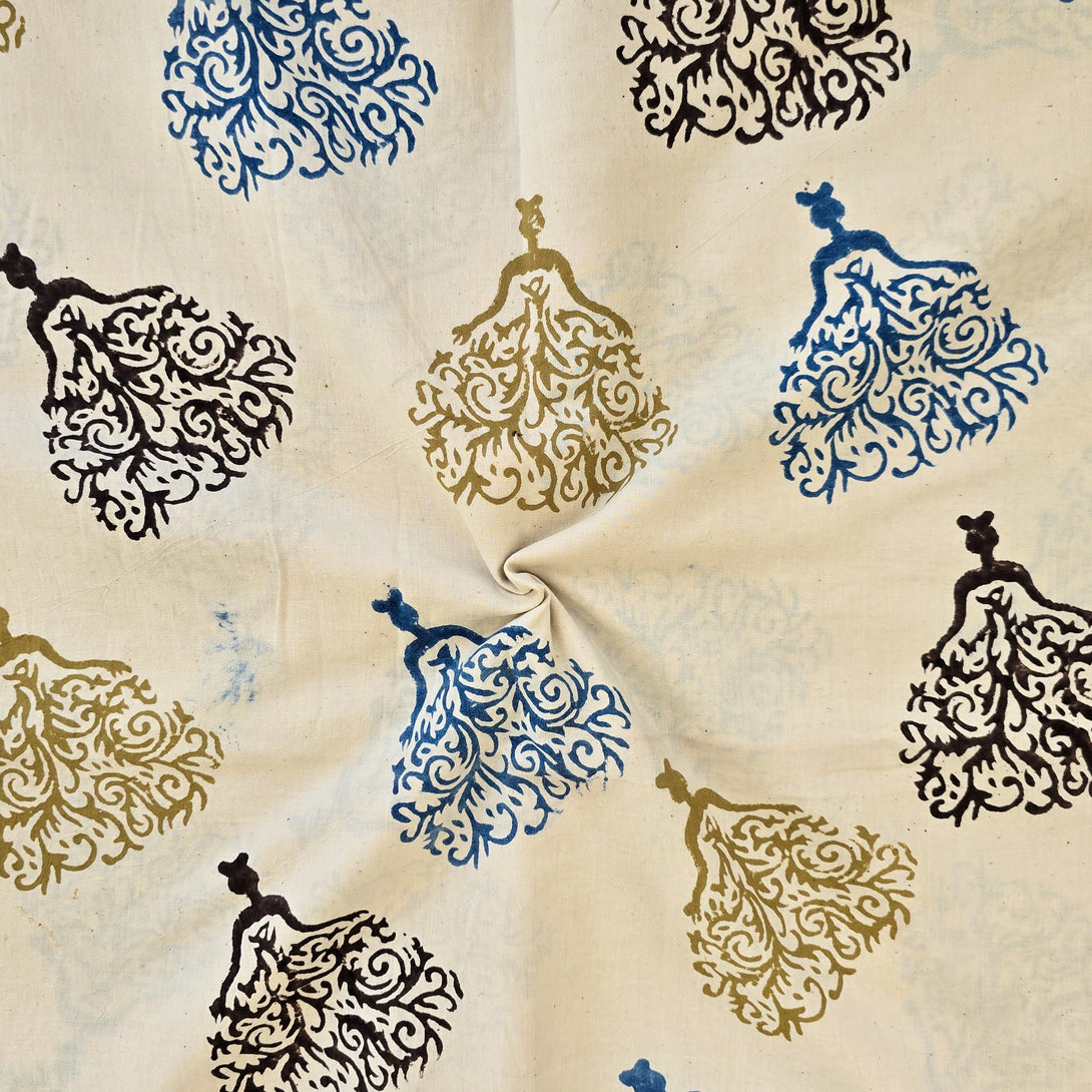 Pure Cotton Ajrak Cream With Blue With Black And Mustard Doll Design Hand Block Print Fabric