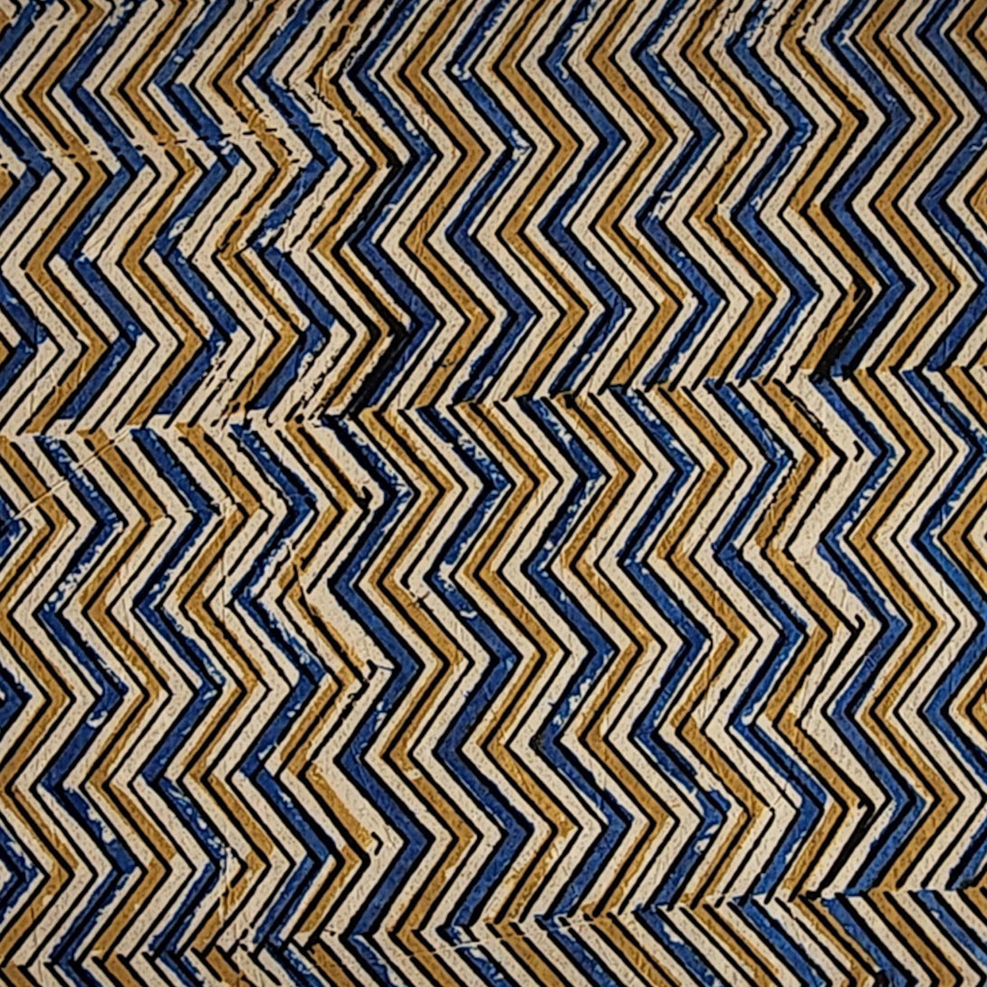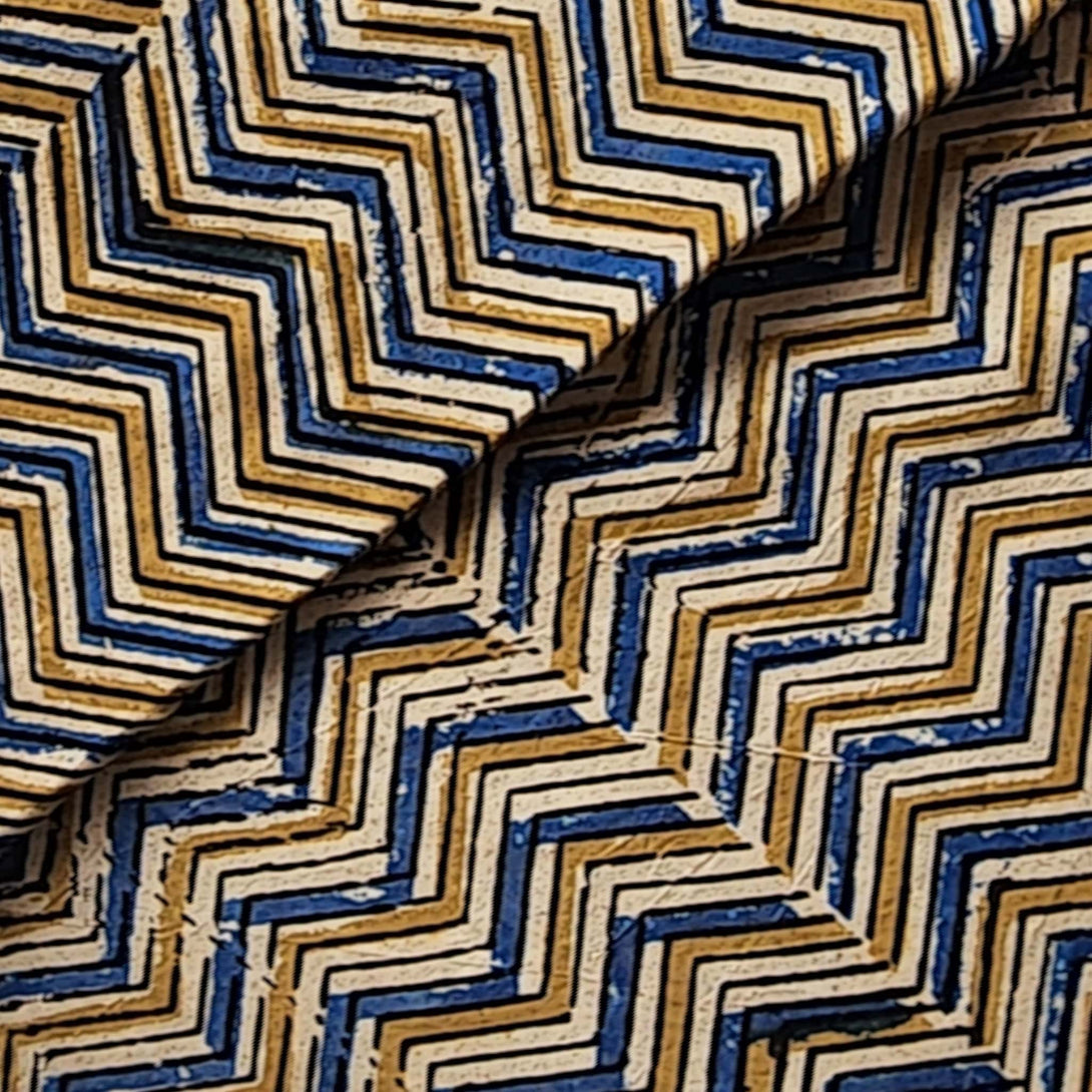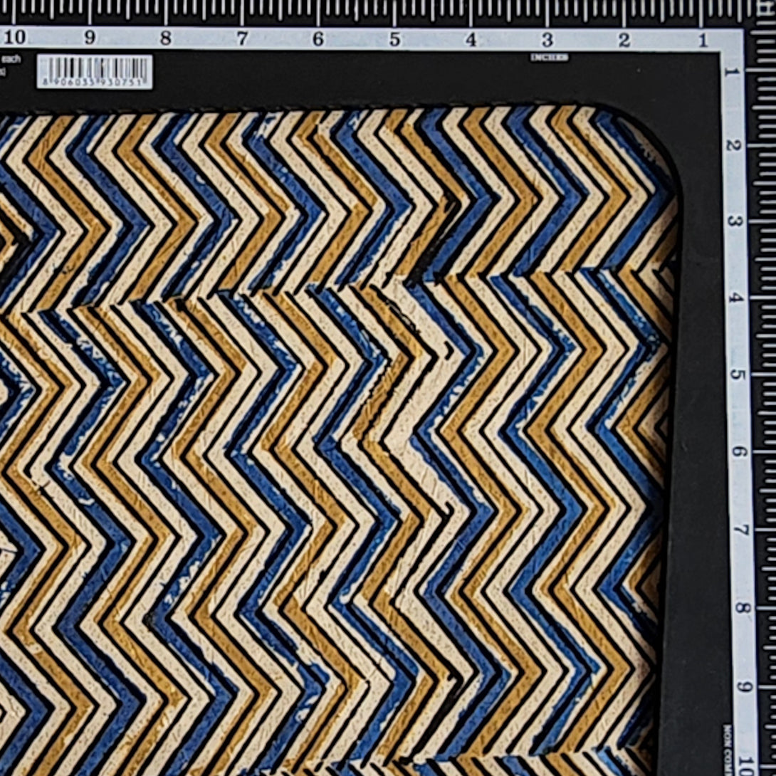 Pure Cotton Ajrak Cream With Blue Zig-Zag Hand Block Print Fabric