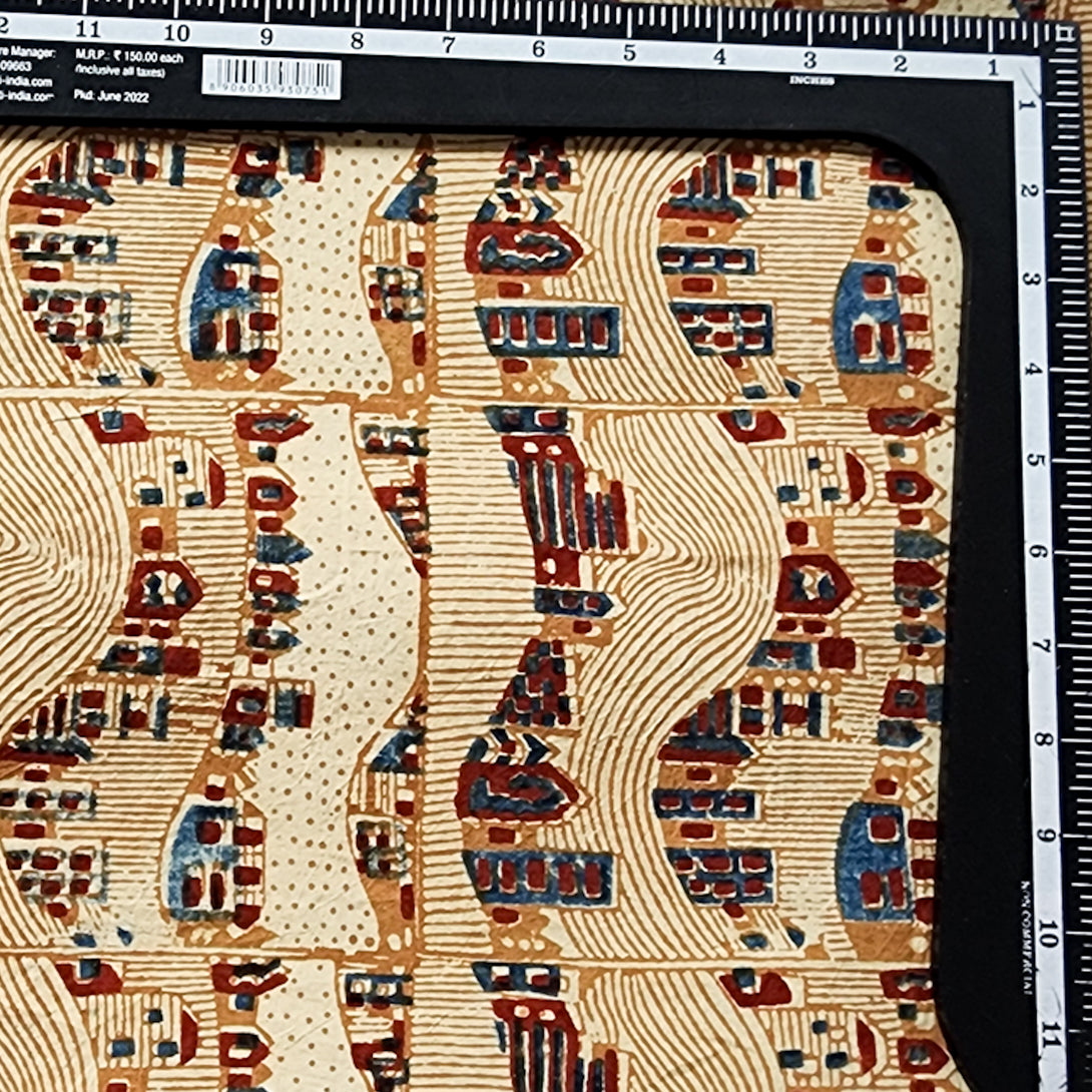 Pure Cotton Ajrak Cream With Mustard Waves And Buildings Hand Block Print Fabric