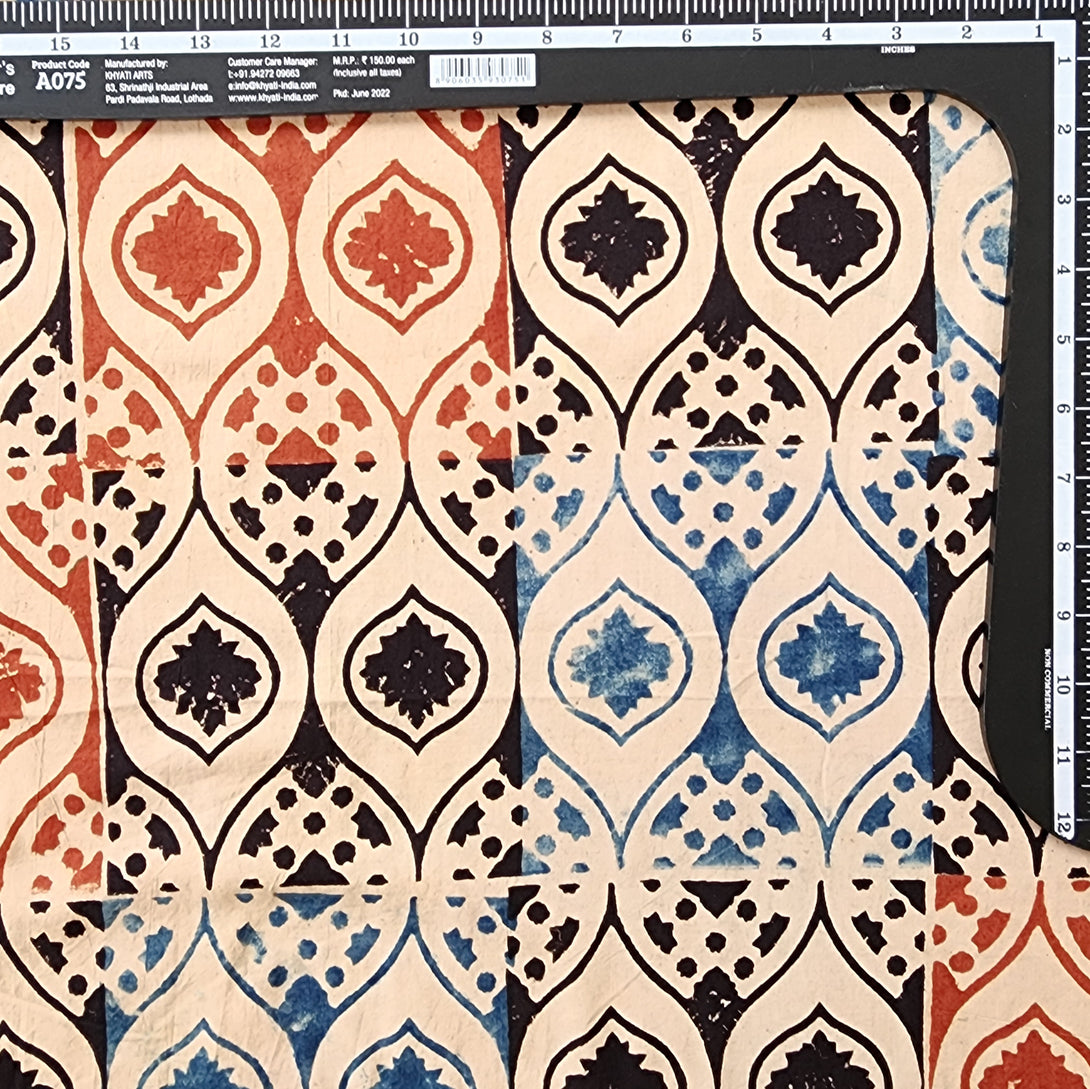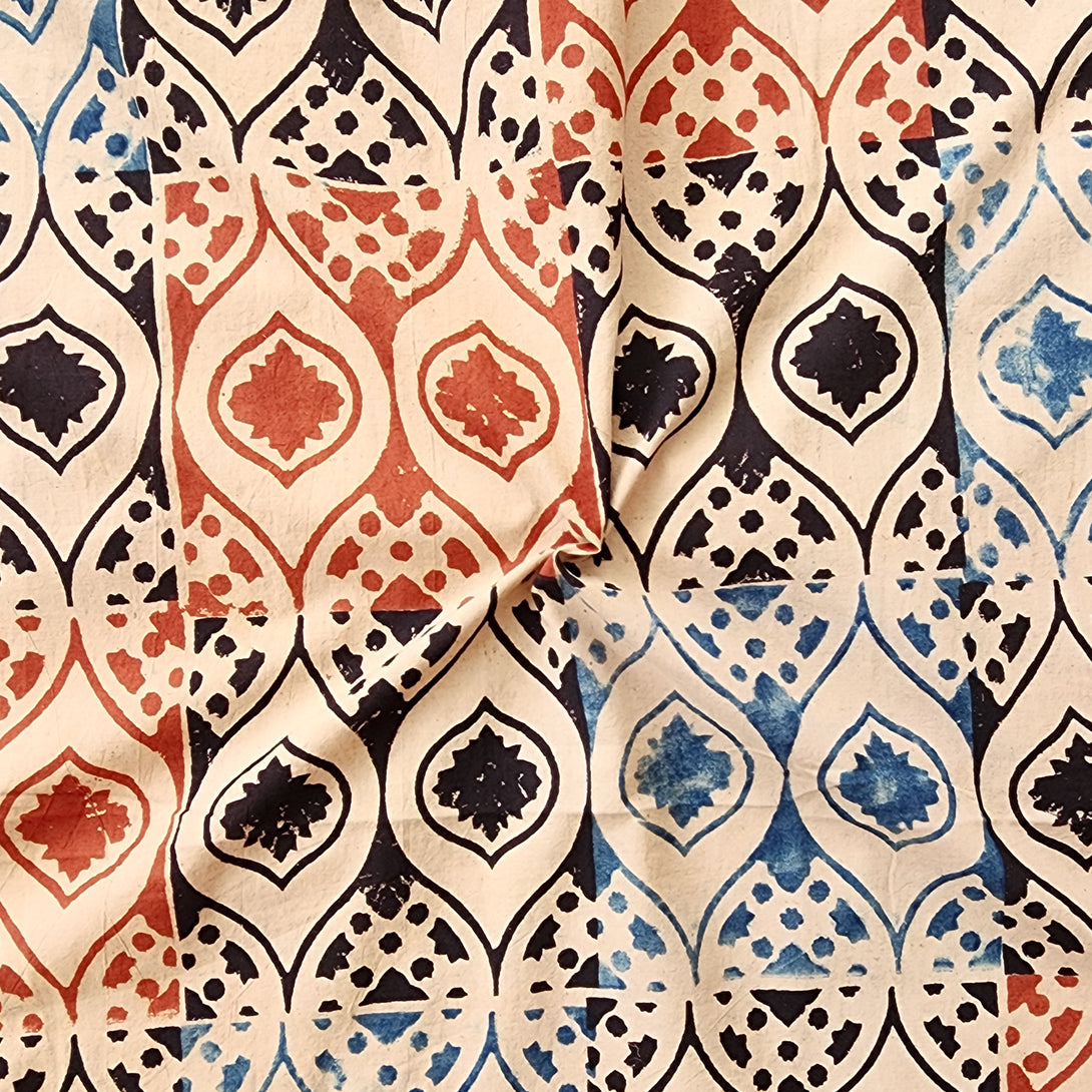 Pure Cotton Ajrak Cream With Orange And Black Intricate Design Tile Hand Block Print Fabric