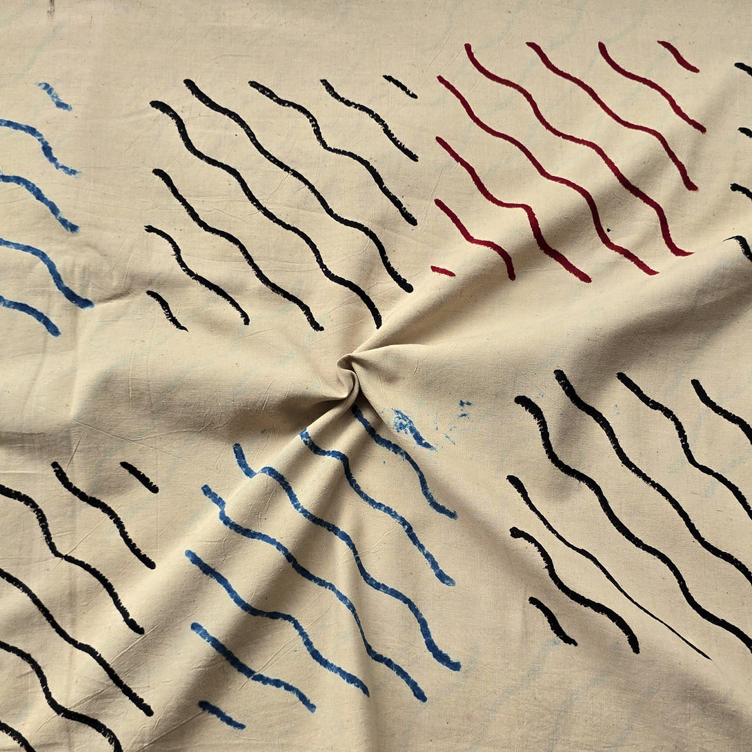 Pure Cotton Ajrak Cream With Rust Blue And Maroon Weaves Hand Block Print Fabric