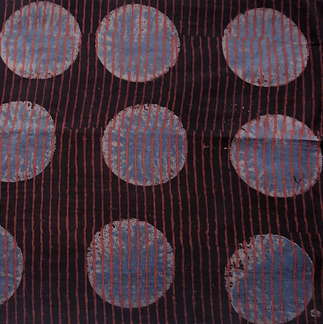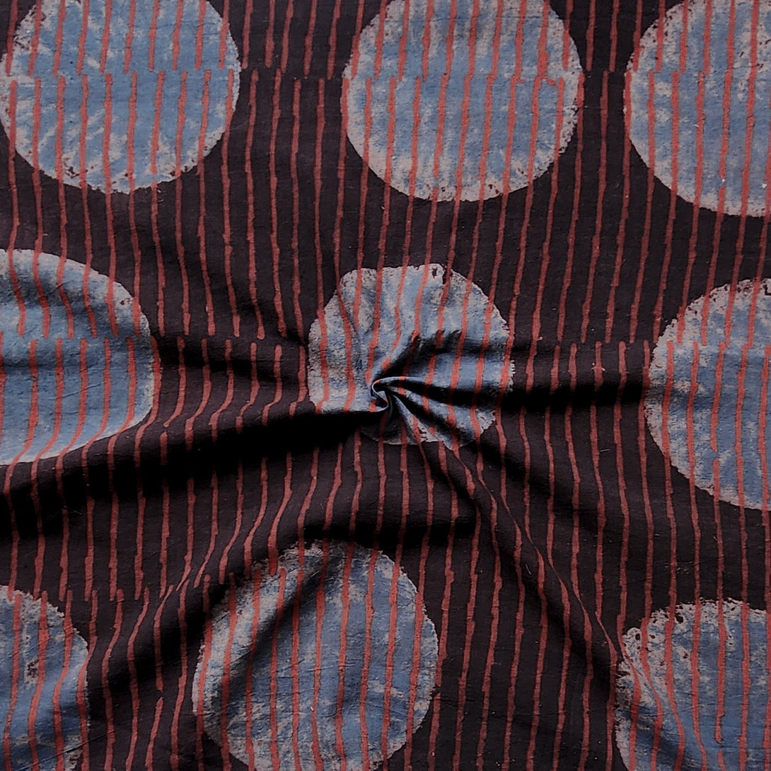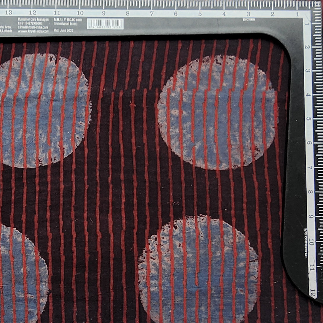 Pure Cotton Ajrak Dark Brown With Blue Big Polka Dot Stripes contemporary design Hand Block Print Fabric