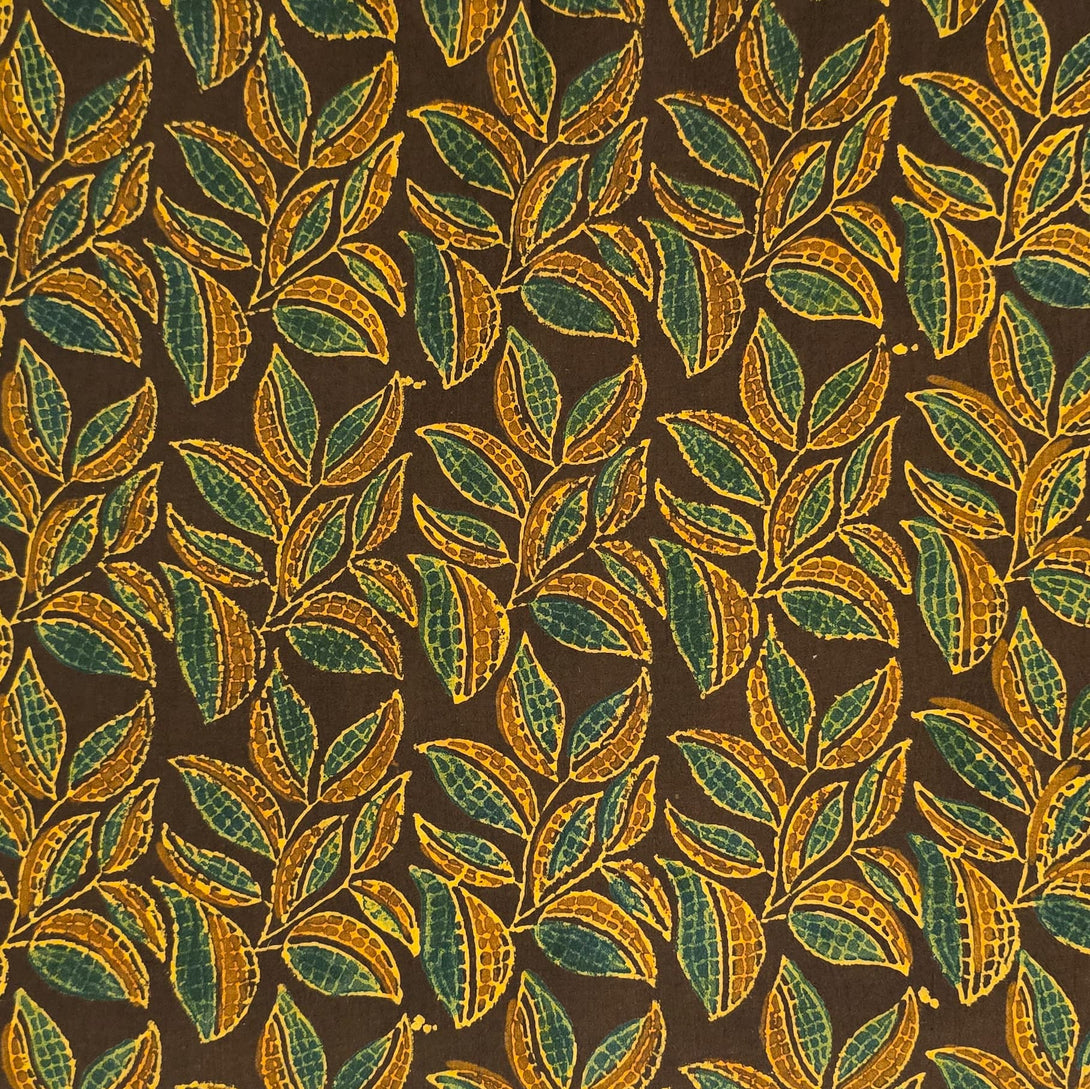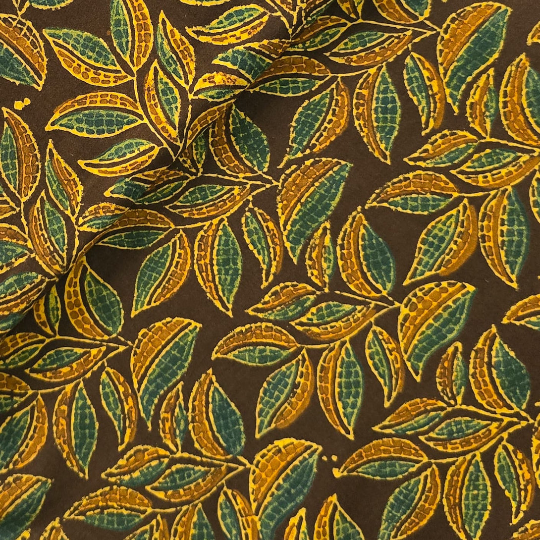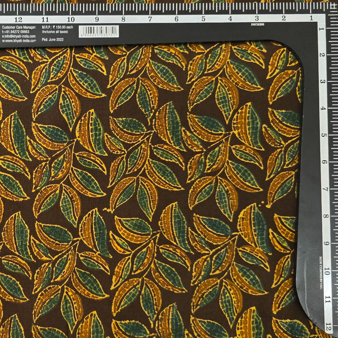 Pure Cotton Ajrak Dark Brown With Green And Yellow Leaves Jaal Hand Block Print Fabric