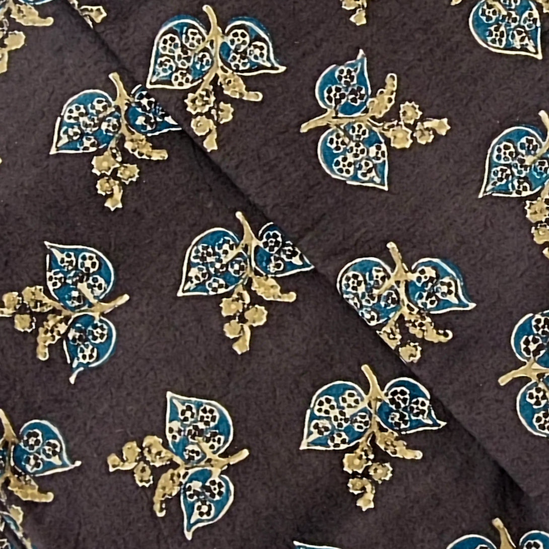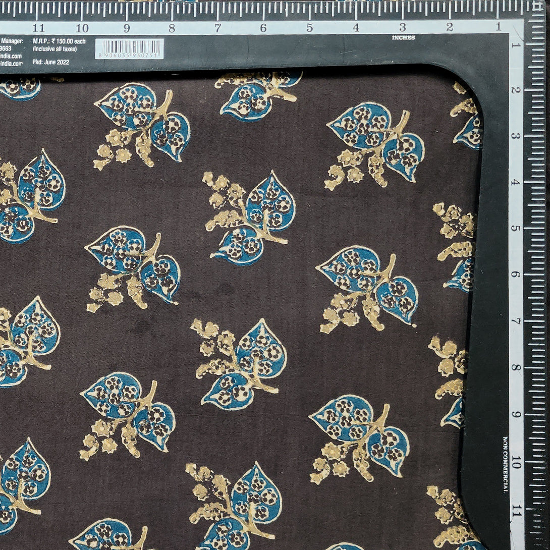Pure Cotton Ajrak Dark Brown With Rust Blue Flower Motif Hand Block Print Fabric