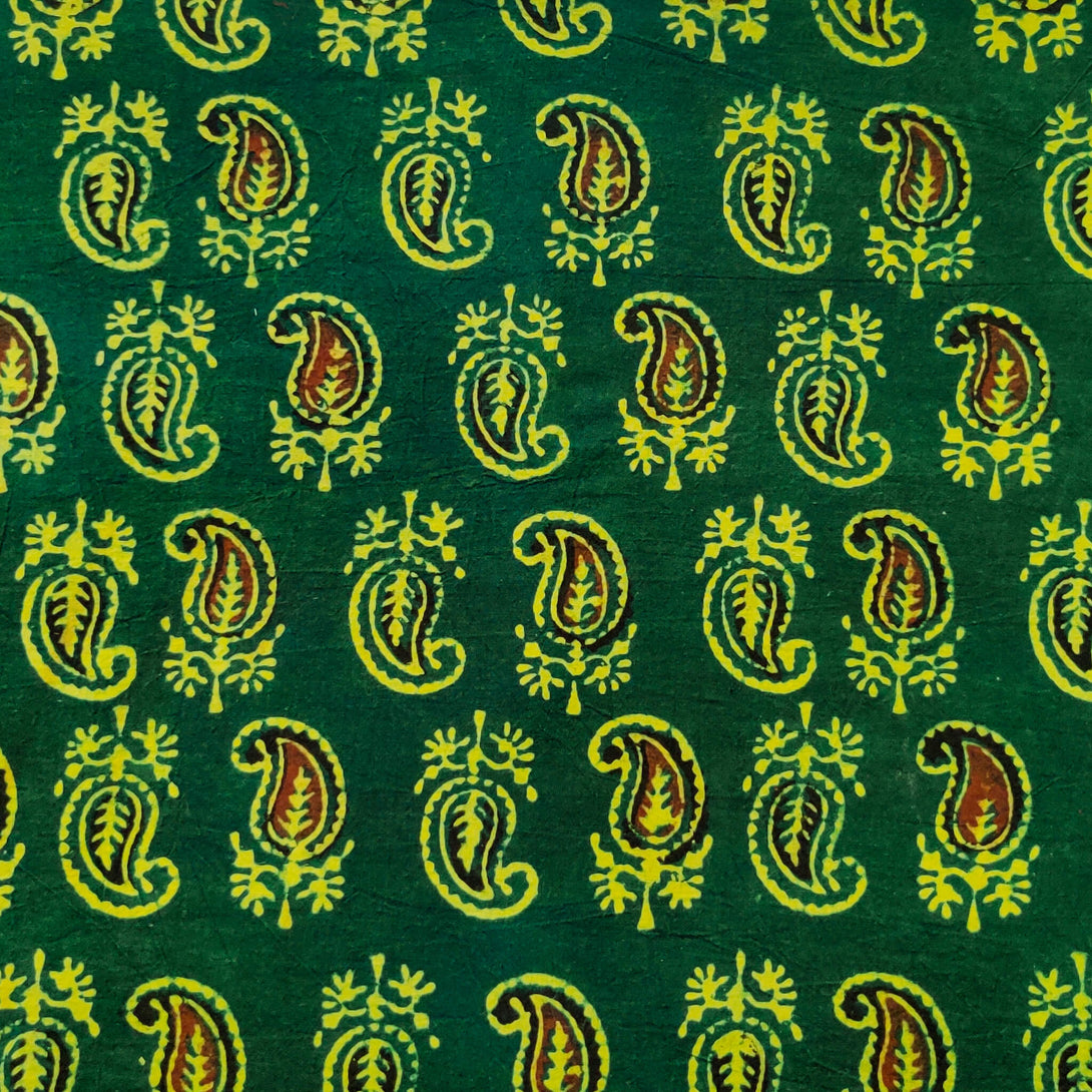Pure Cotton Ajrak Dark Green With Black And Red Kairi Leaf Motif Hand Block Print Fabric