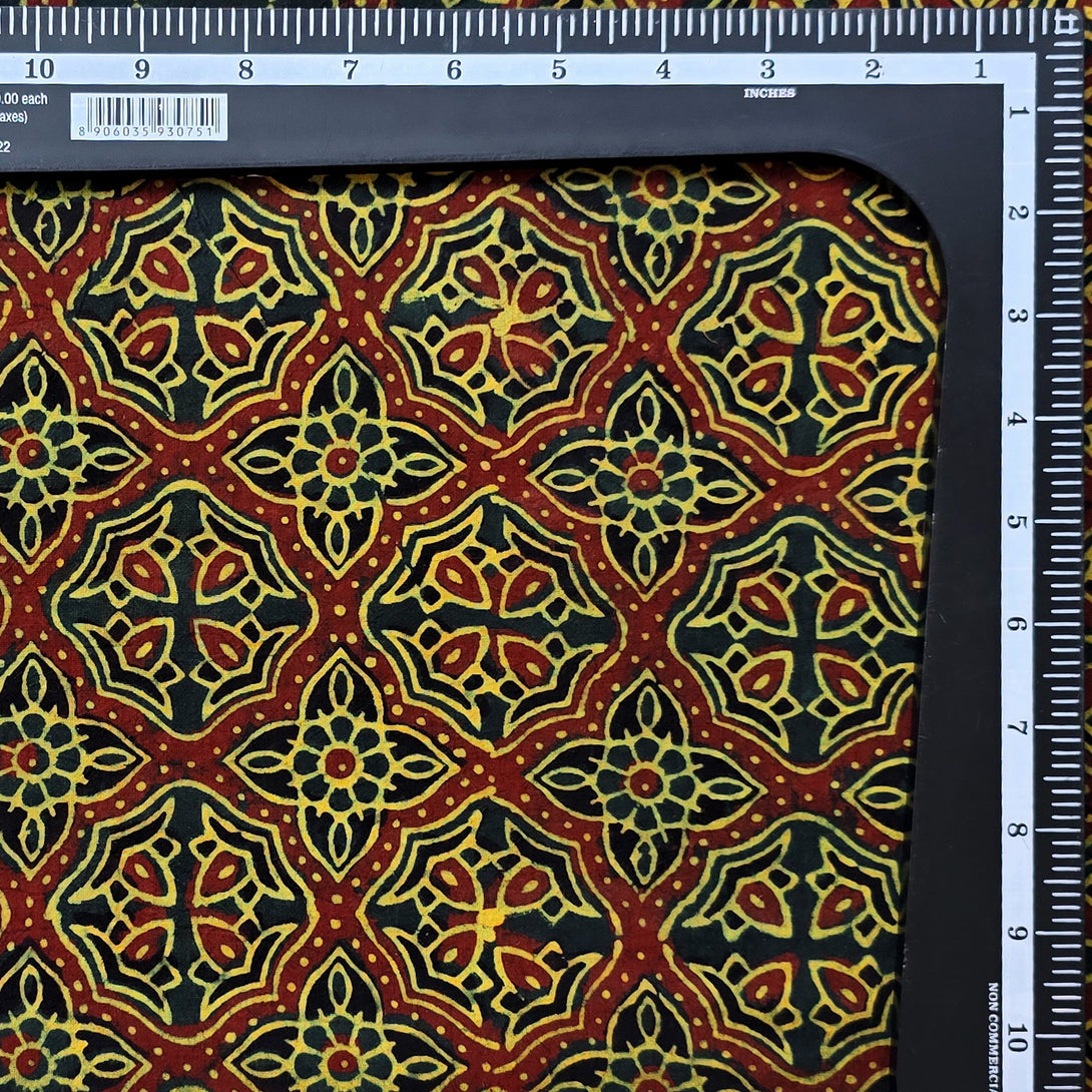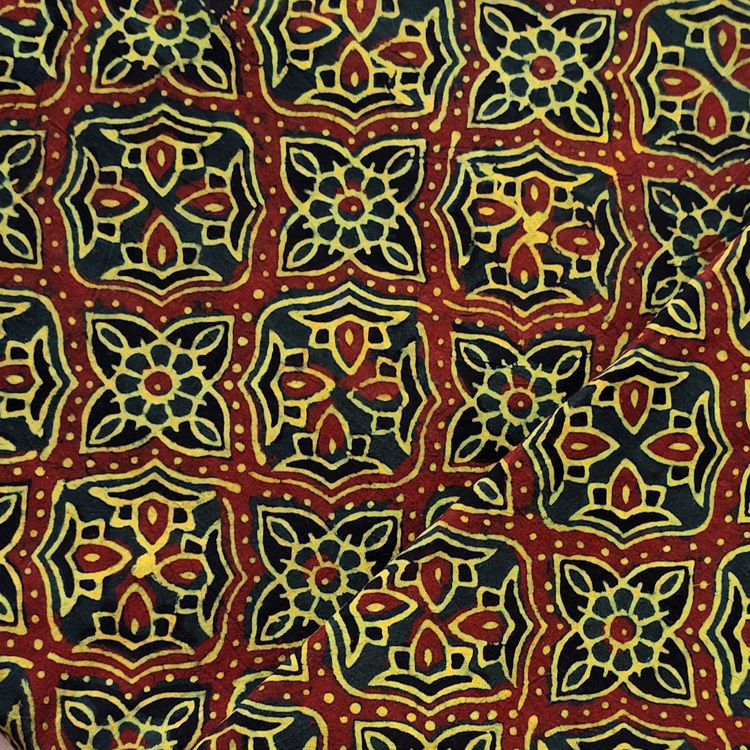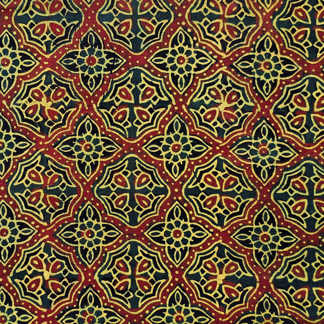 Pure Cotton Ajrak Dark Green With Red Intricate Design Hand Block Print Fabric