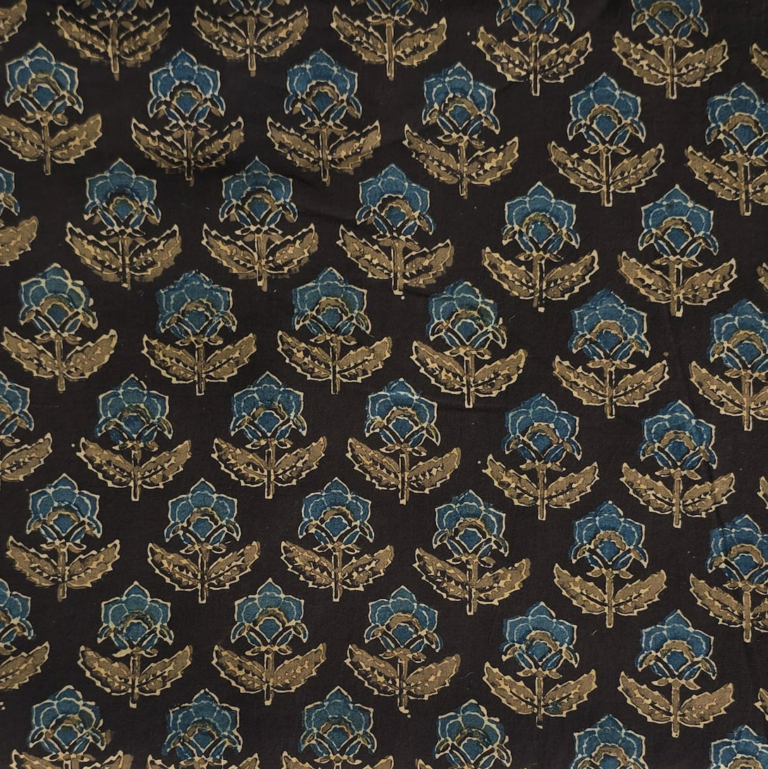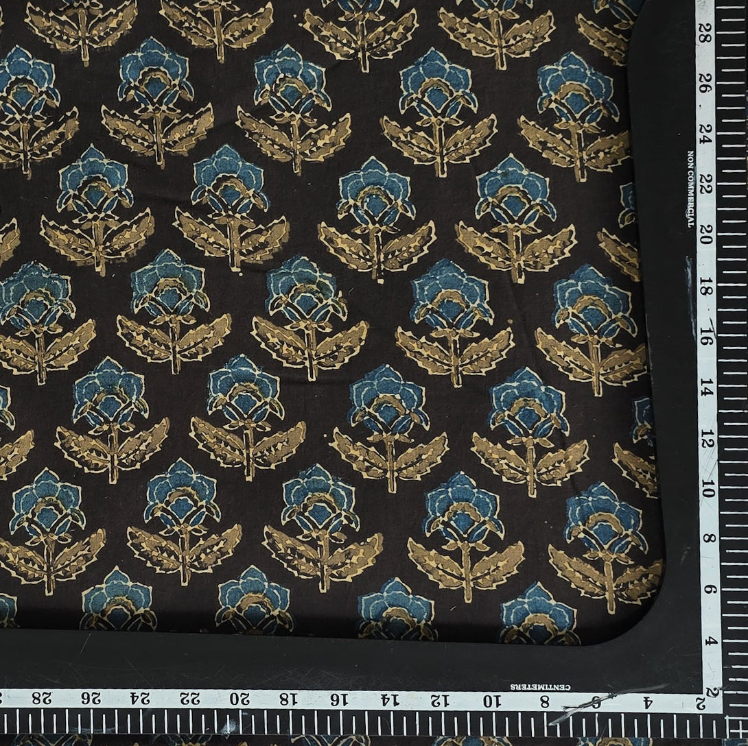 Pure Cotton Ajrak Double Dark Brown With Blue Border Flower Motif Hand Block Print Fabric