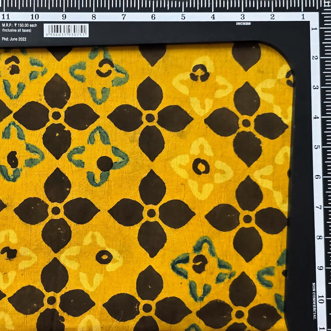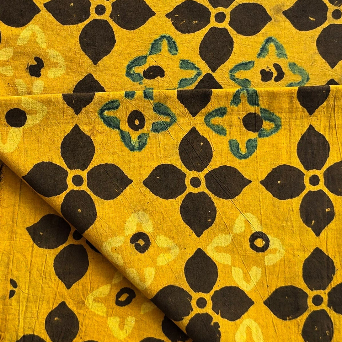 Pure Cotton Ajrak Geometrical Design Flower Yellow Hand Block Print Fabric