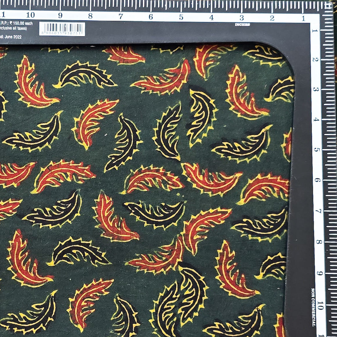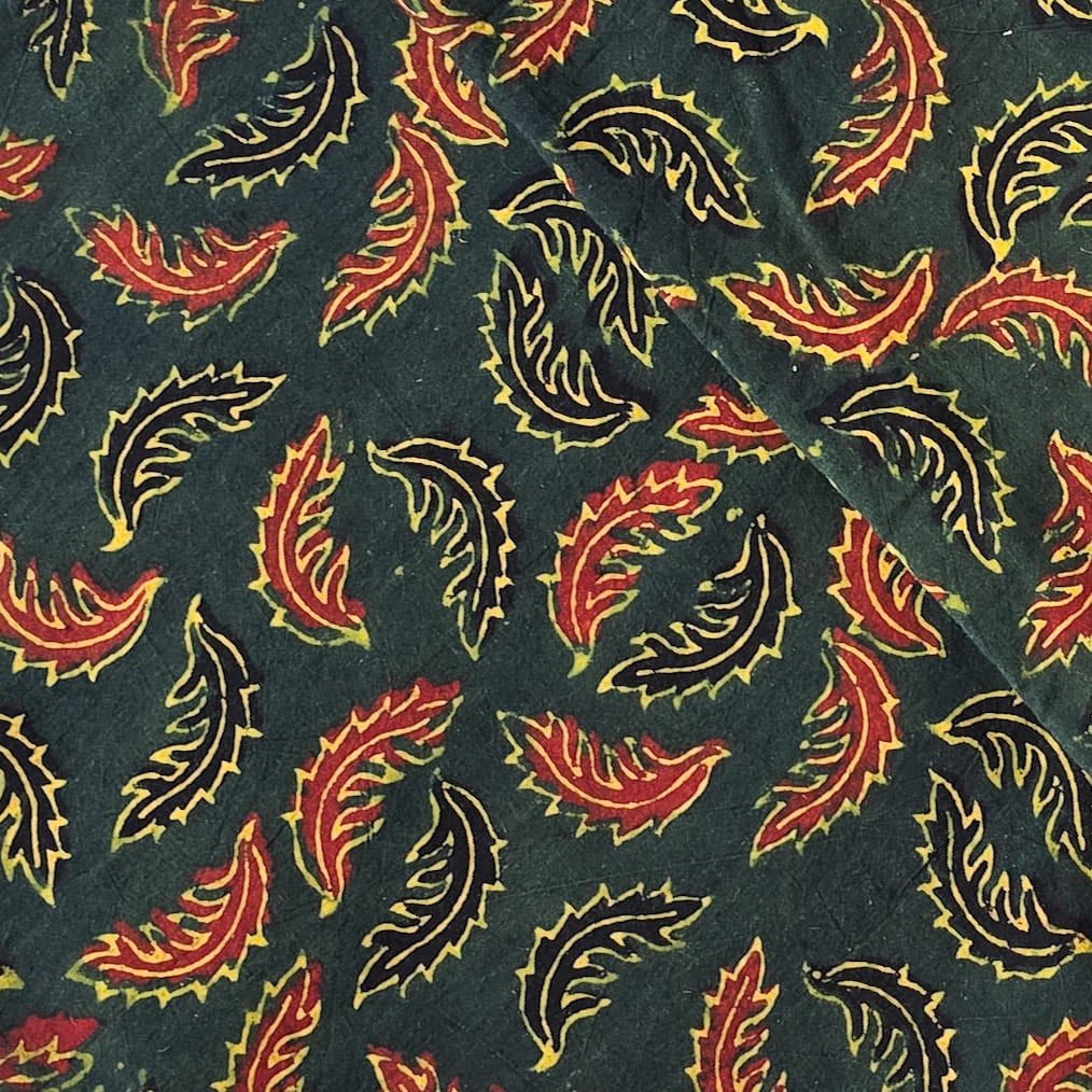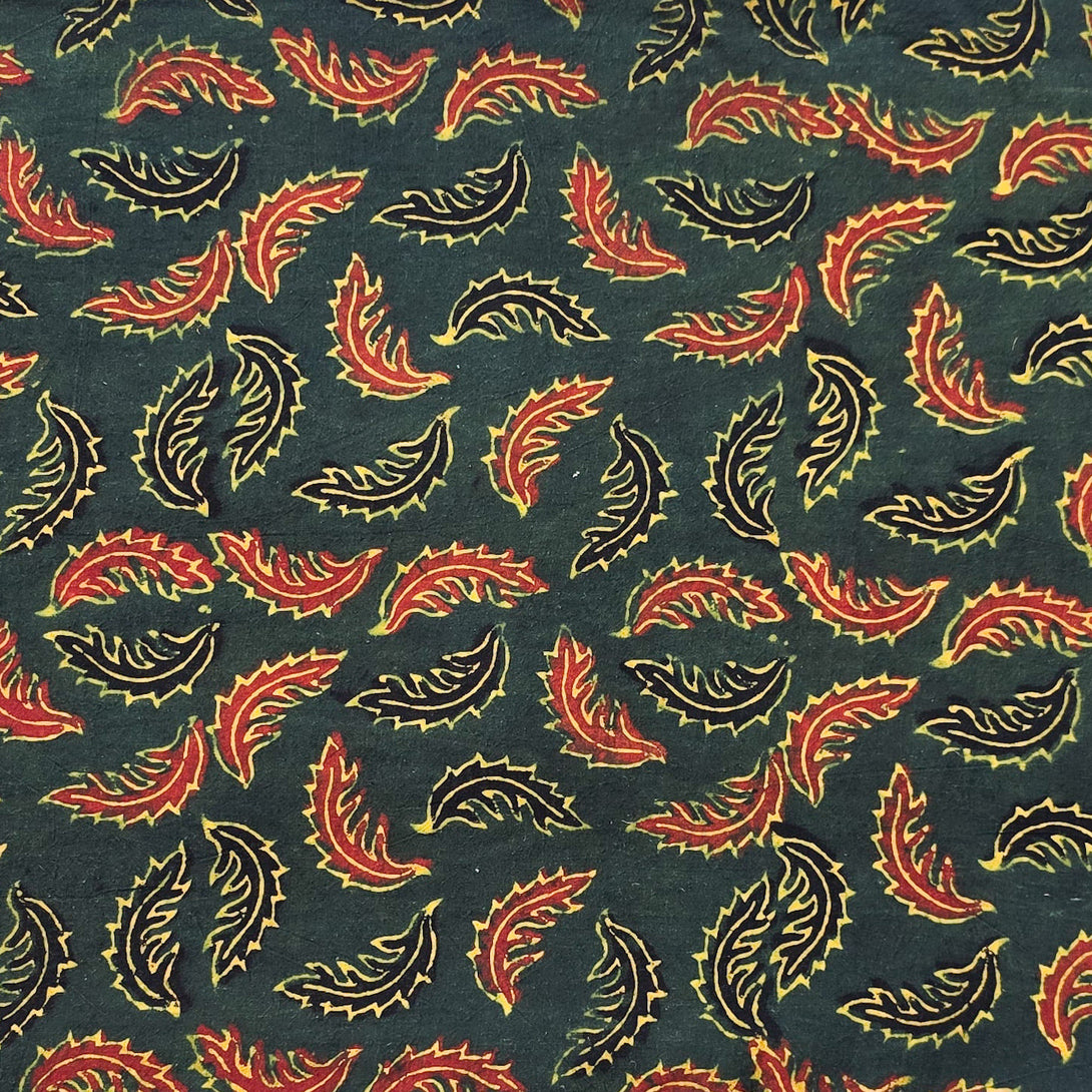 Pure Cotton Ajrak Green With Red And Black Leaves Motif Hand Block Print Fabric