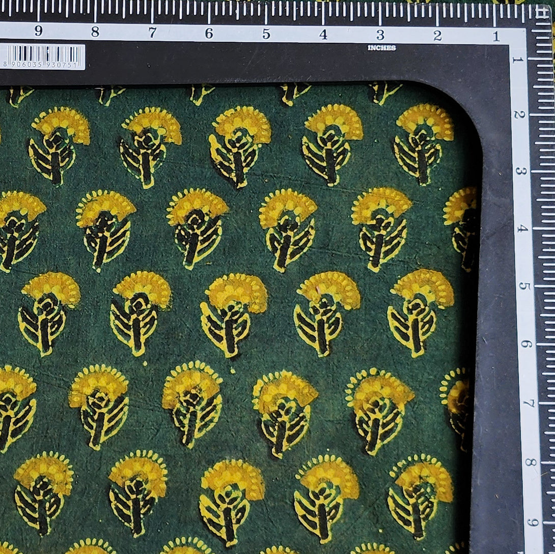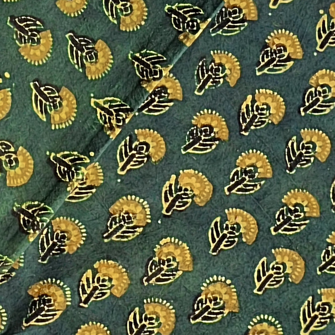 Pure Cotton Ajrak Green With Yellow Flower Motif Hand Block Print Fabric