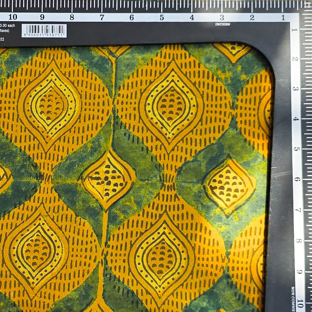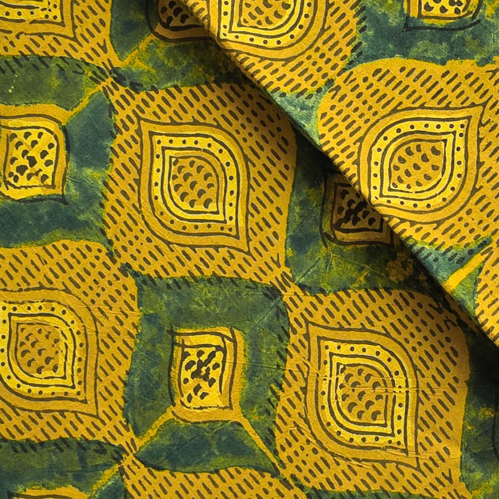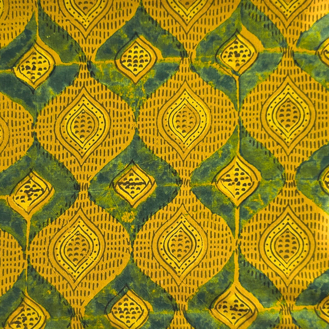 Pure Cotton Ajrak Mustard With Green Intricate Diamond Design Hand Block Print Fabric