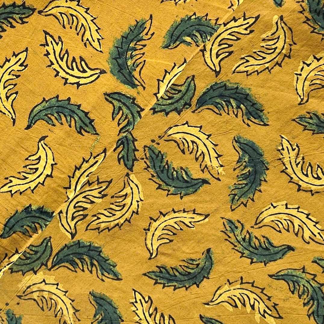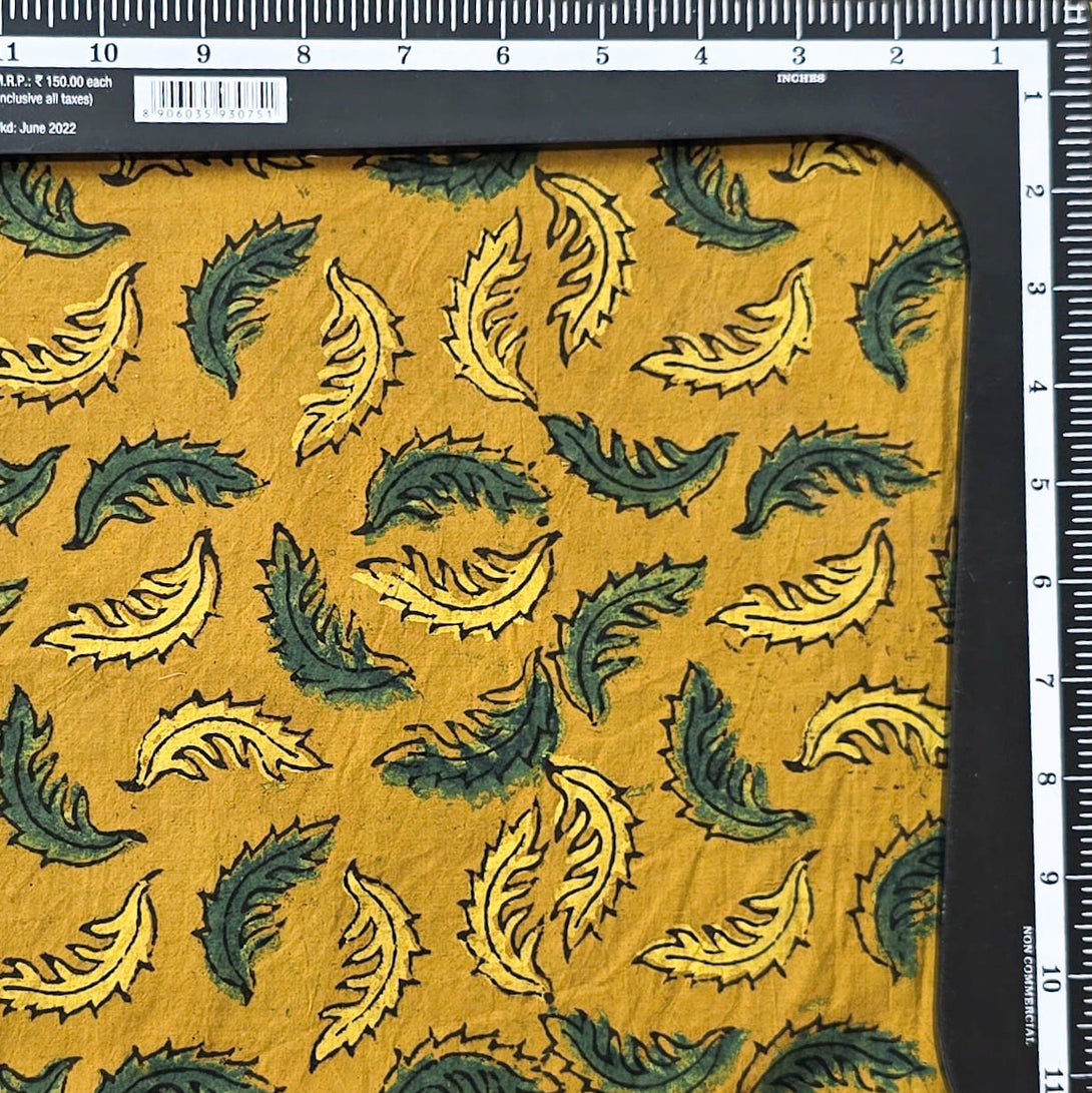 Pure Cotton Ajrak Mustard With Green Leaves Motif Hand Block Print Fabric