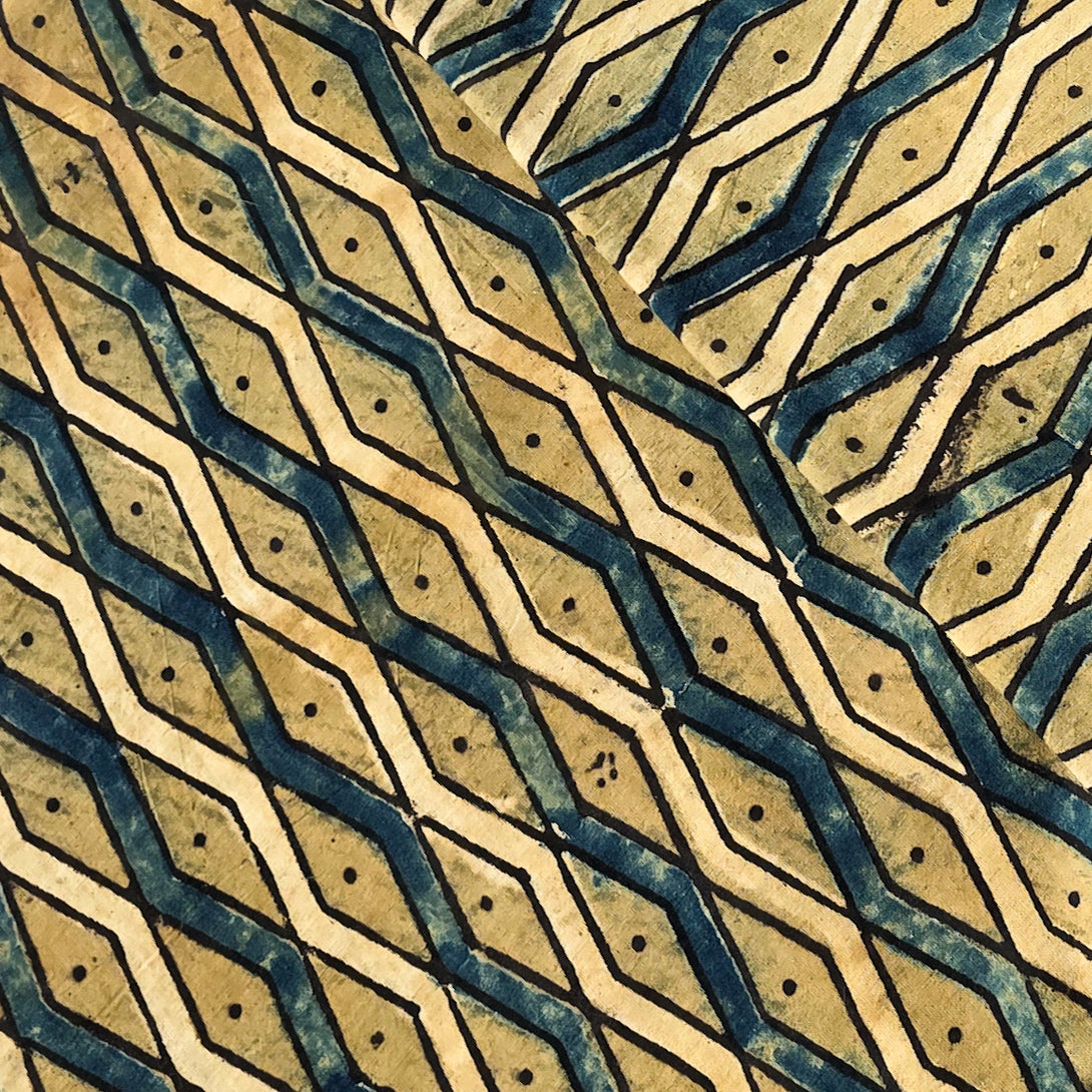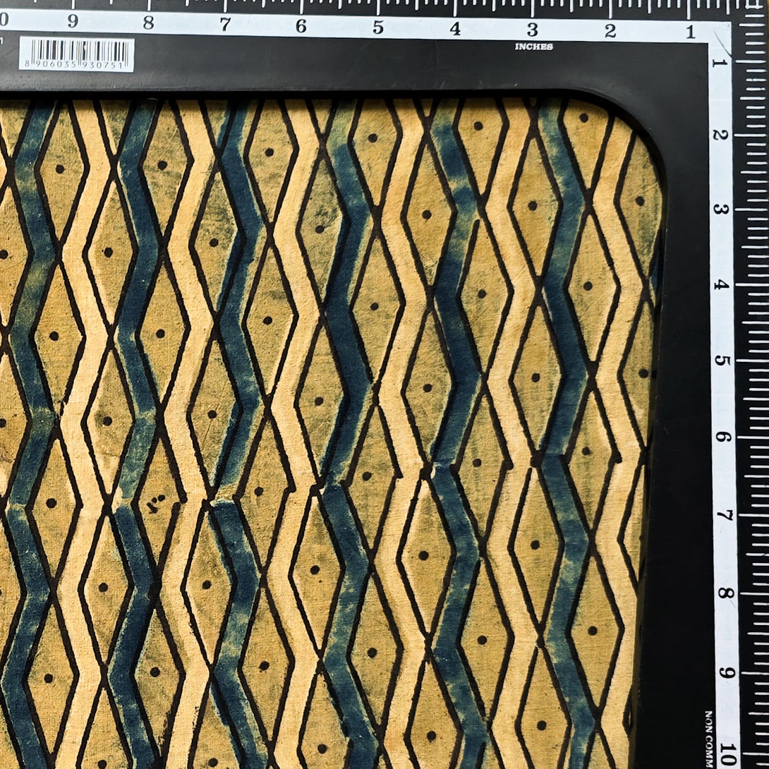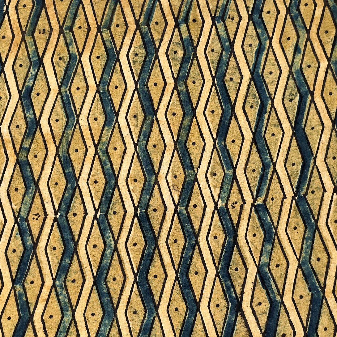 Pure Cotton Ajrak Mustard With Rust Blue And Cream geometric pattern Hand Block Print Fabric
