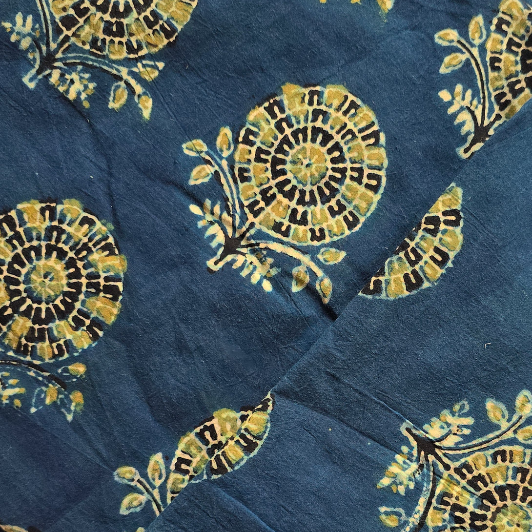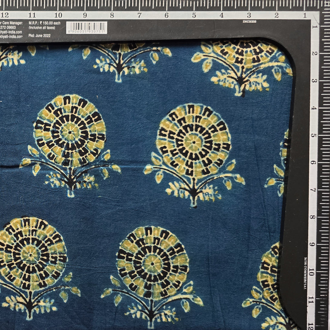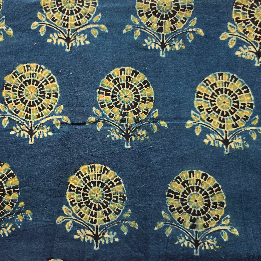 Pure Cotton Ajrak Persian Blue With Big Flower Motif Hand Block Print Fabric