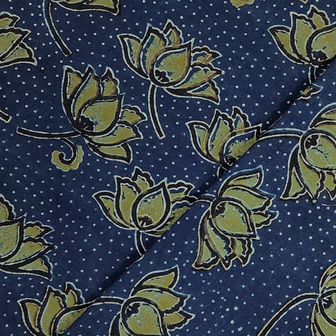 Pure Cotton Ajrak Persian Blue With Green Kamal Hand Block Print Fabric