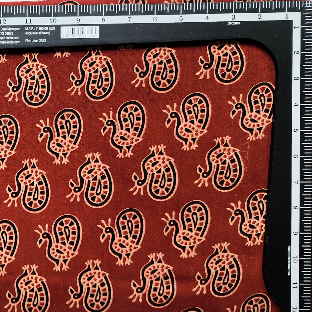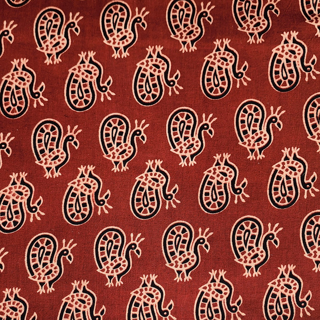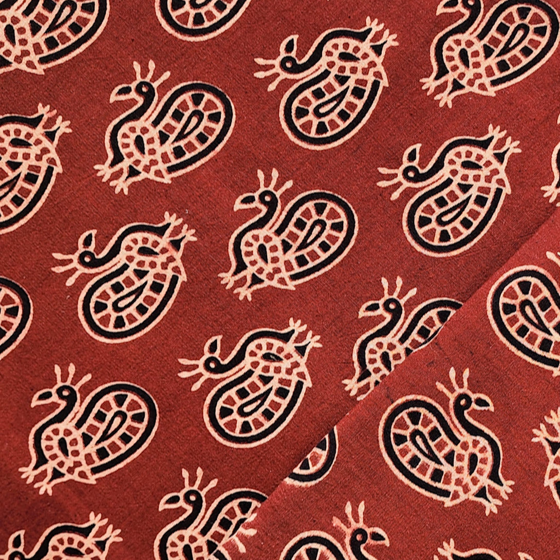 Pure Cotton Ajrak Red With Black Bird Motif Hand Block Print Fabric