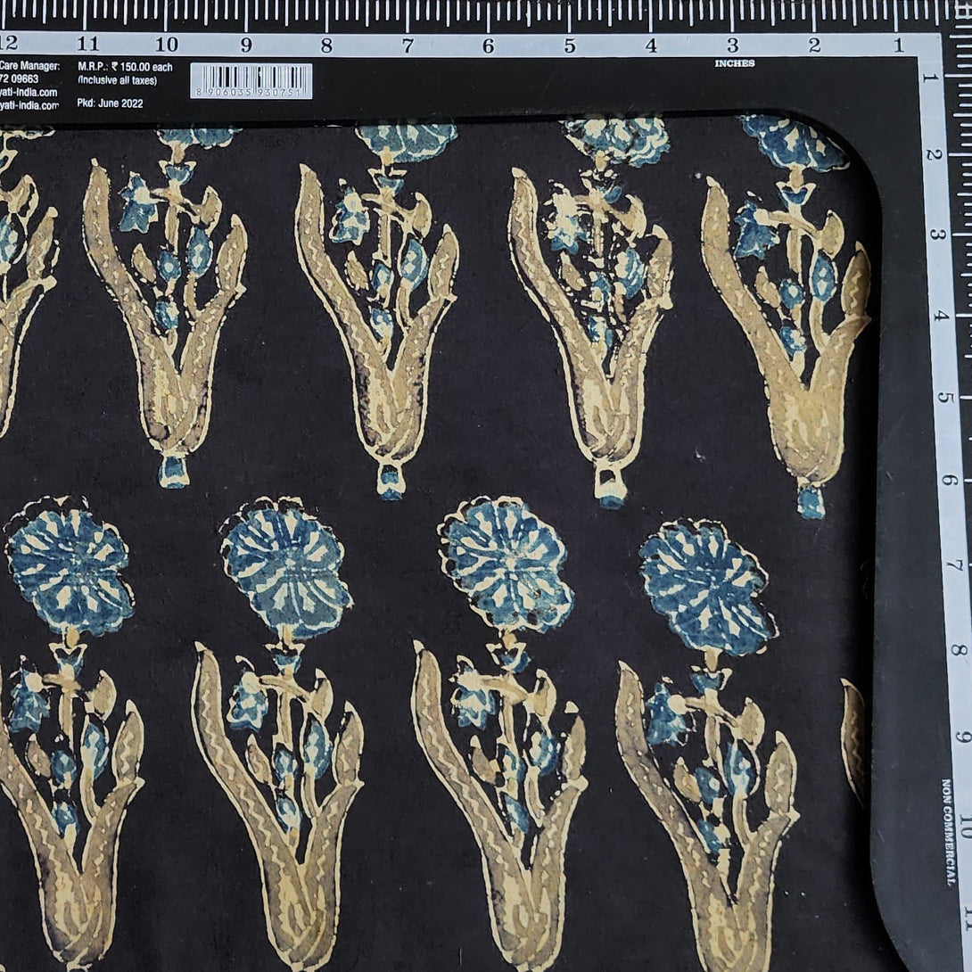 Pure Cotton Ajrak Rust Black With Blue Big Flower Motif Design Hand Block Print Fabric
