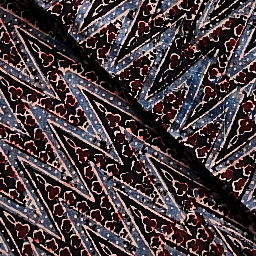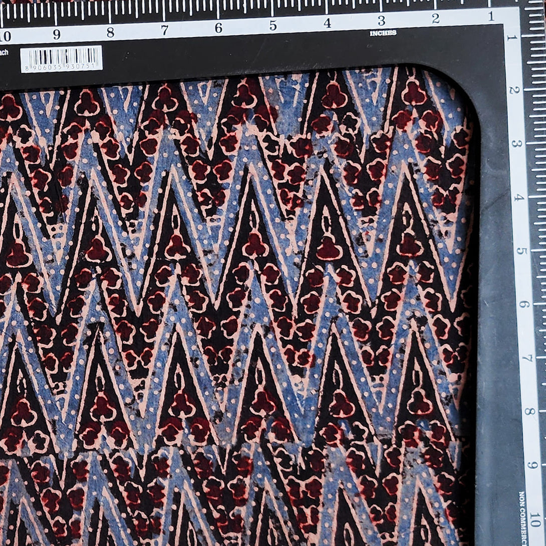 Pure Cotton Ajrak Rust Black With Greyish Blue Zig-Zag Intricate Design Hand Block Print Fabric