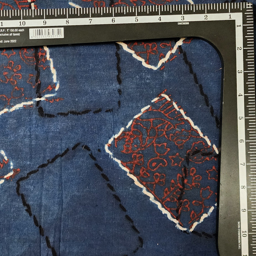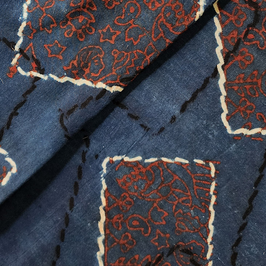 Pure Cotton Ajrak Rust Blue With Red With White And Black Photo Frames Design Hand Block Print Fabric