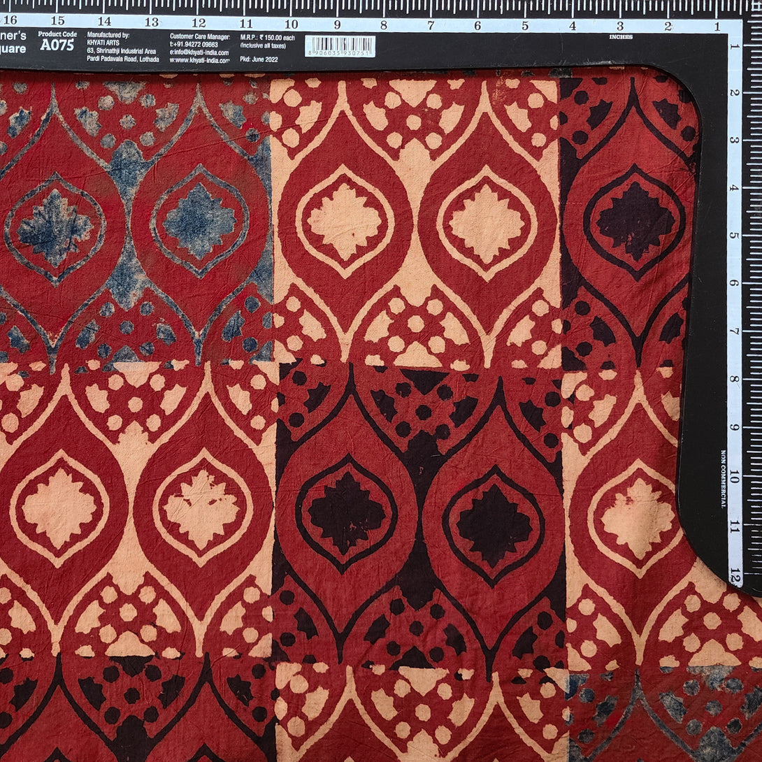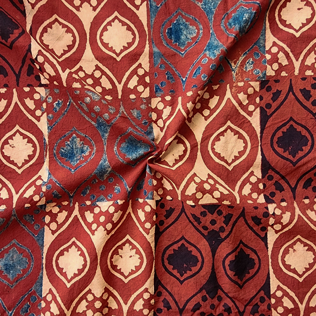 Pure Cotton Ajrak Rust Red With Blue And Cream Intricate Design Tile Hand Block Print Fabric