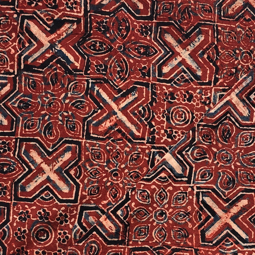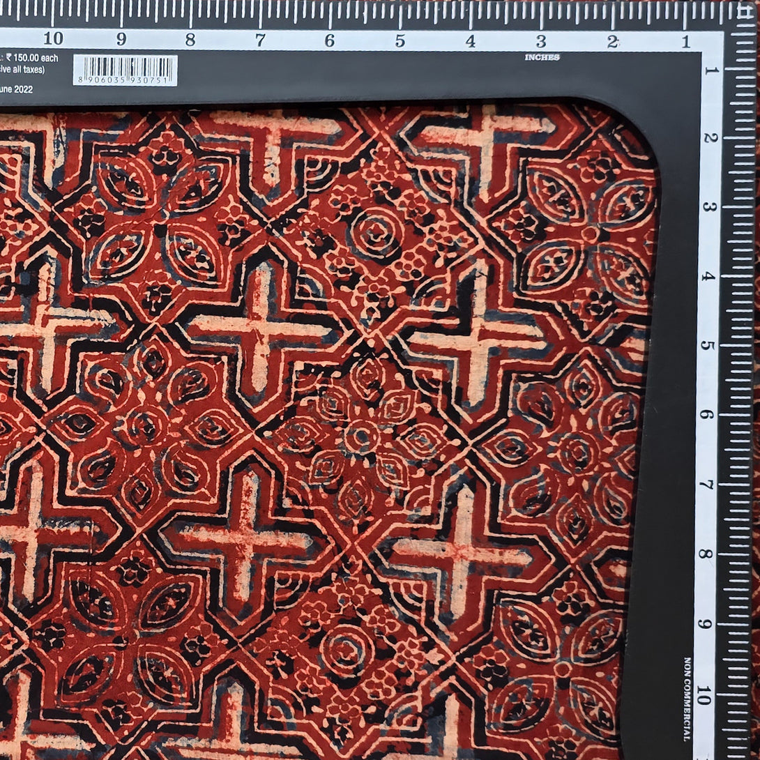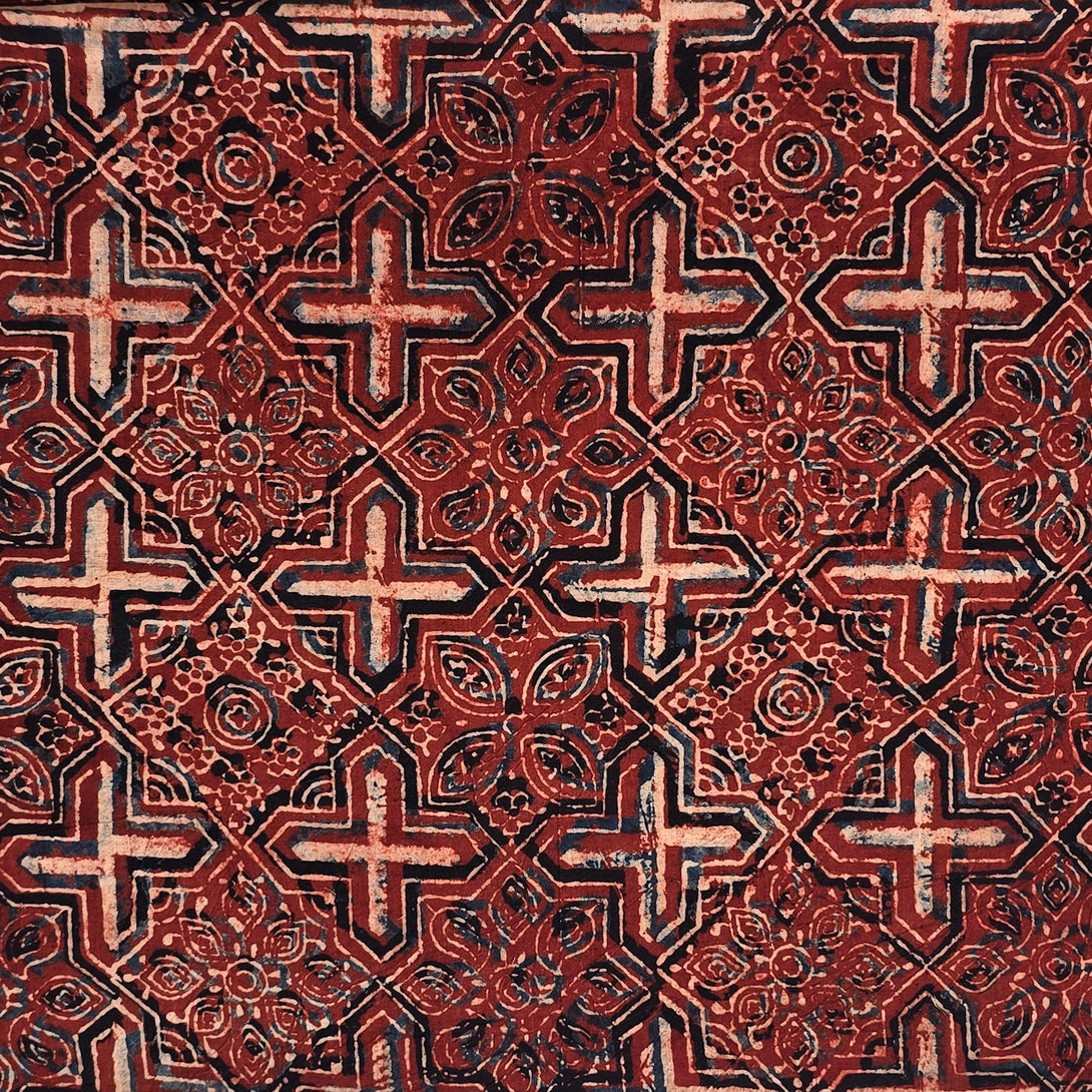 Pure Cotton Ajrak Rust Red With Blue Plus And Intricate Design Hand Block Print Fabric