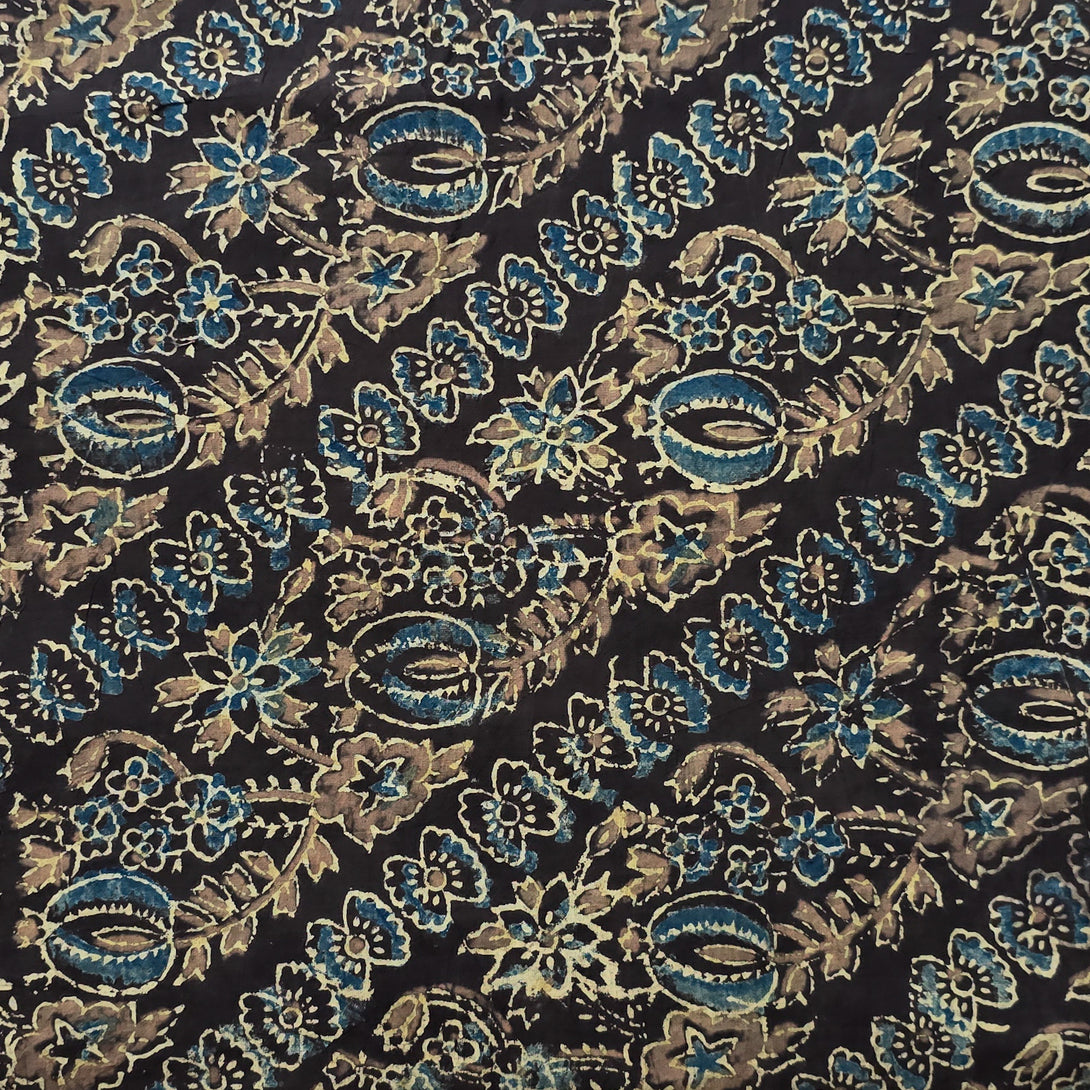Pure Cotton Ajrak Sandy Brown With Blue Fruit And Flower Jaal Hand Block Print Fabric