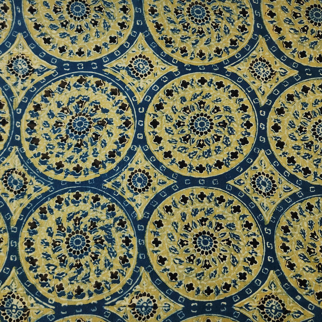 Pure Cotton Ajrak Sandy Brown With Blue Intricate Chakkar Design Hand Block Print Fabric