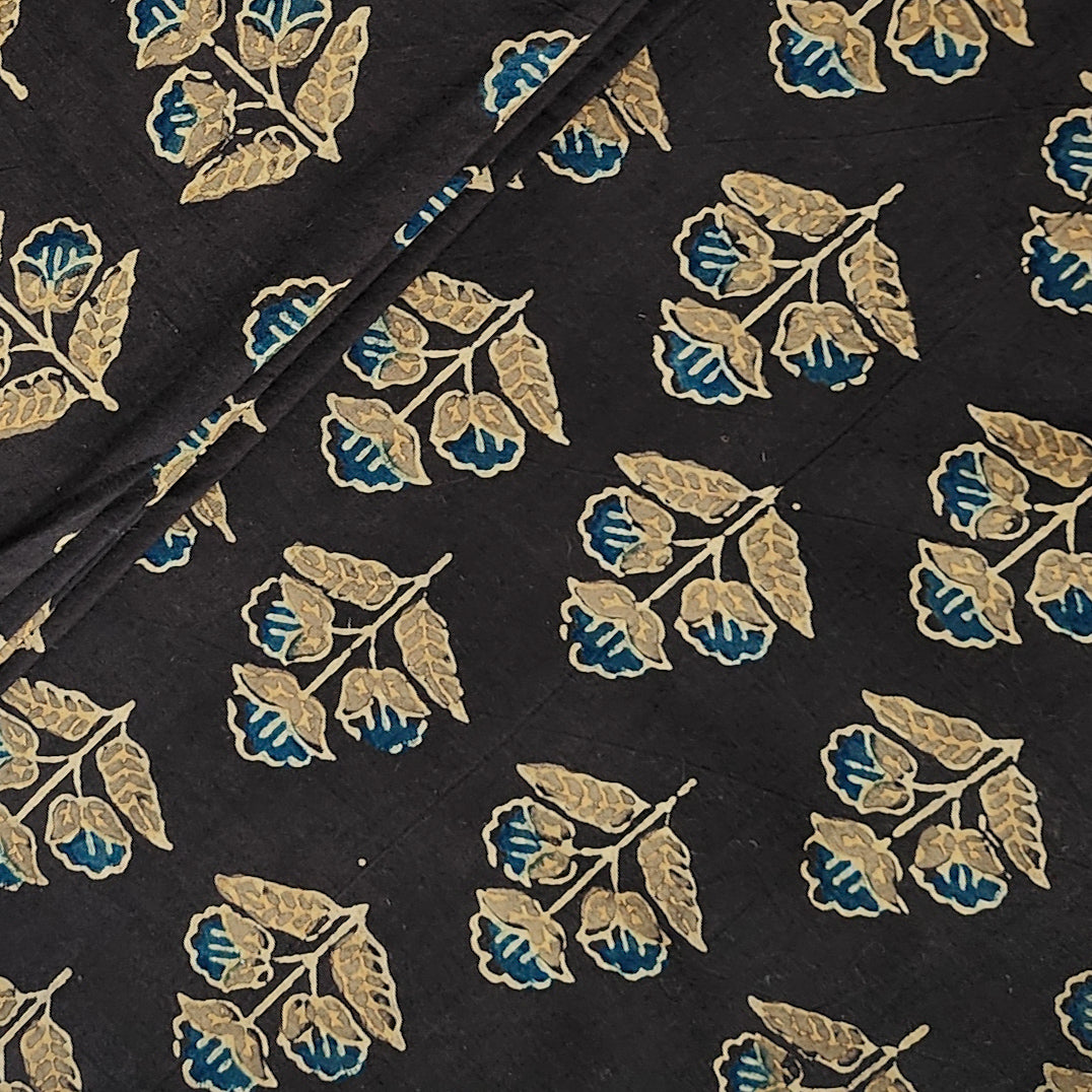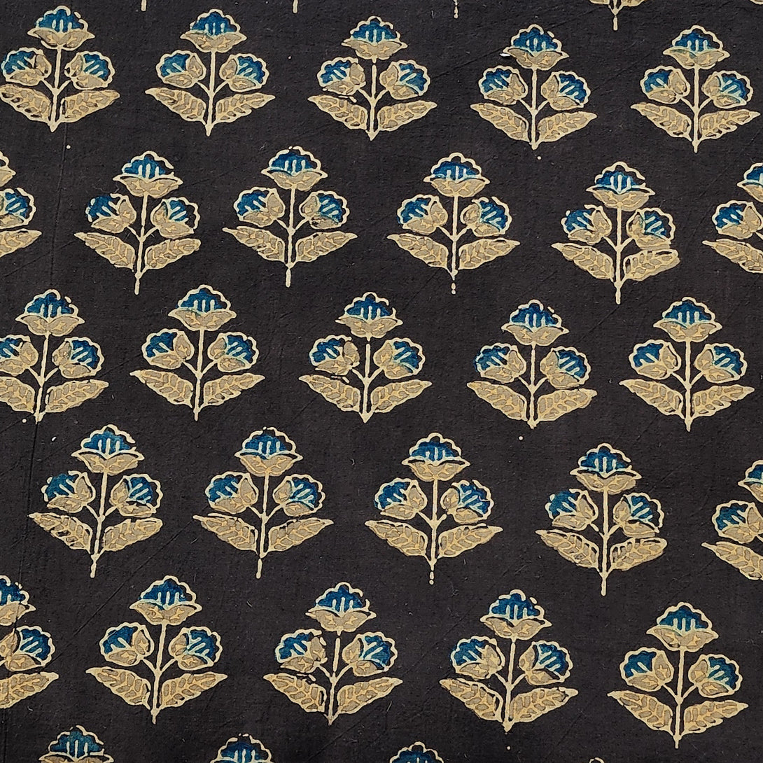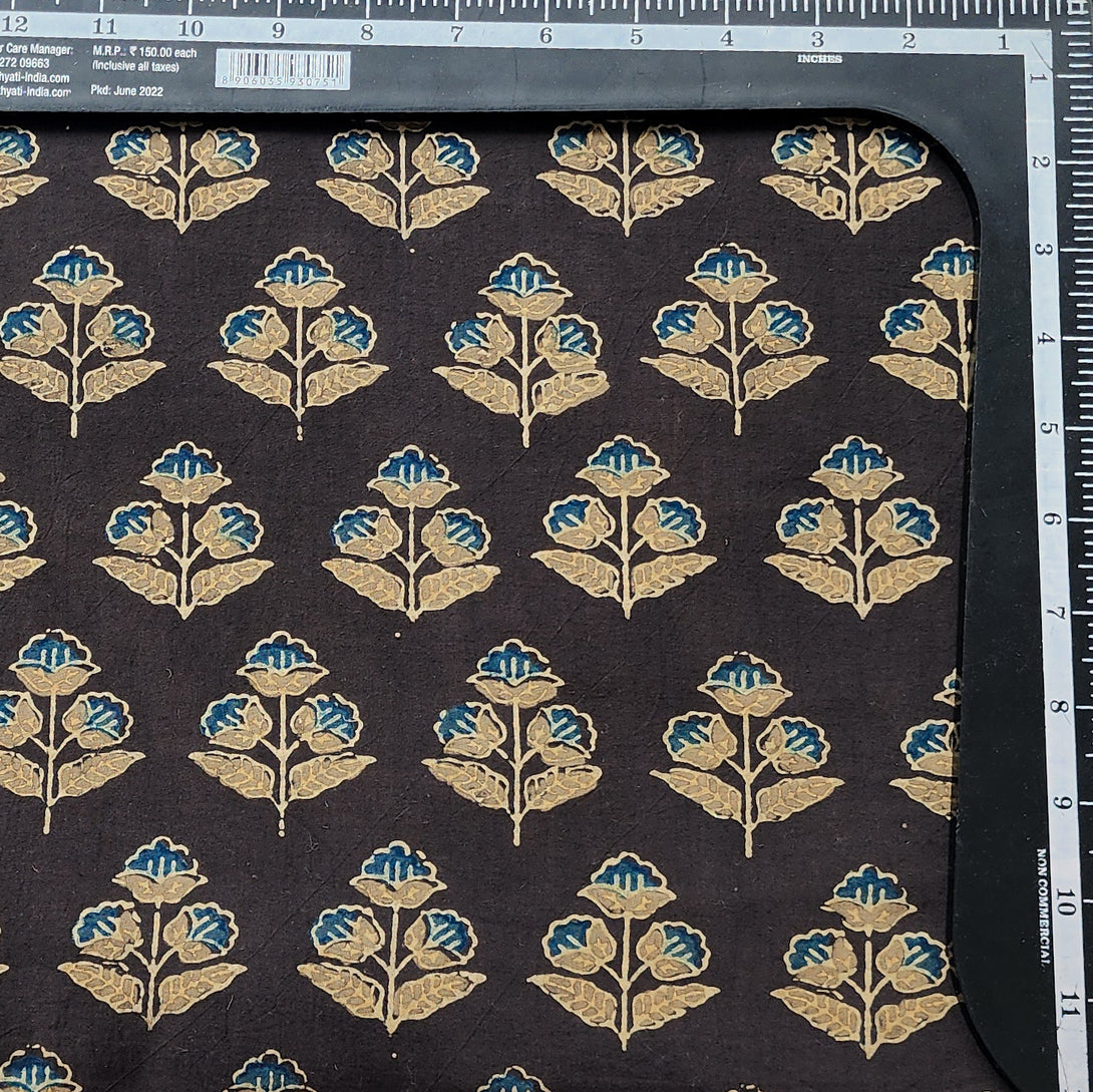 Pure Cotton Gad Ajrak Dark Brown With Blue Flower Motif Hand Block Print Fabric
