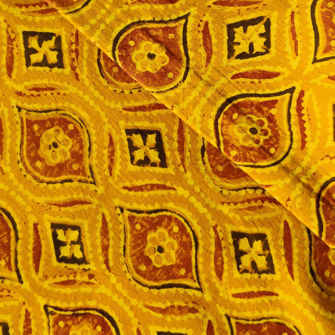 Pure Cotton Ajrak Turmeric Dyed With Rust Blobby Geometric Pattern Hand Block Print Fabric