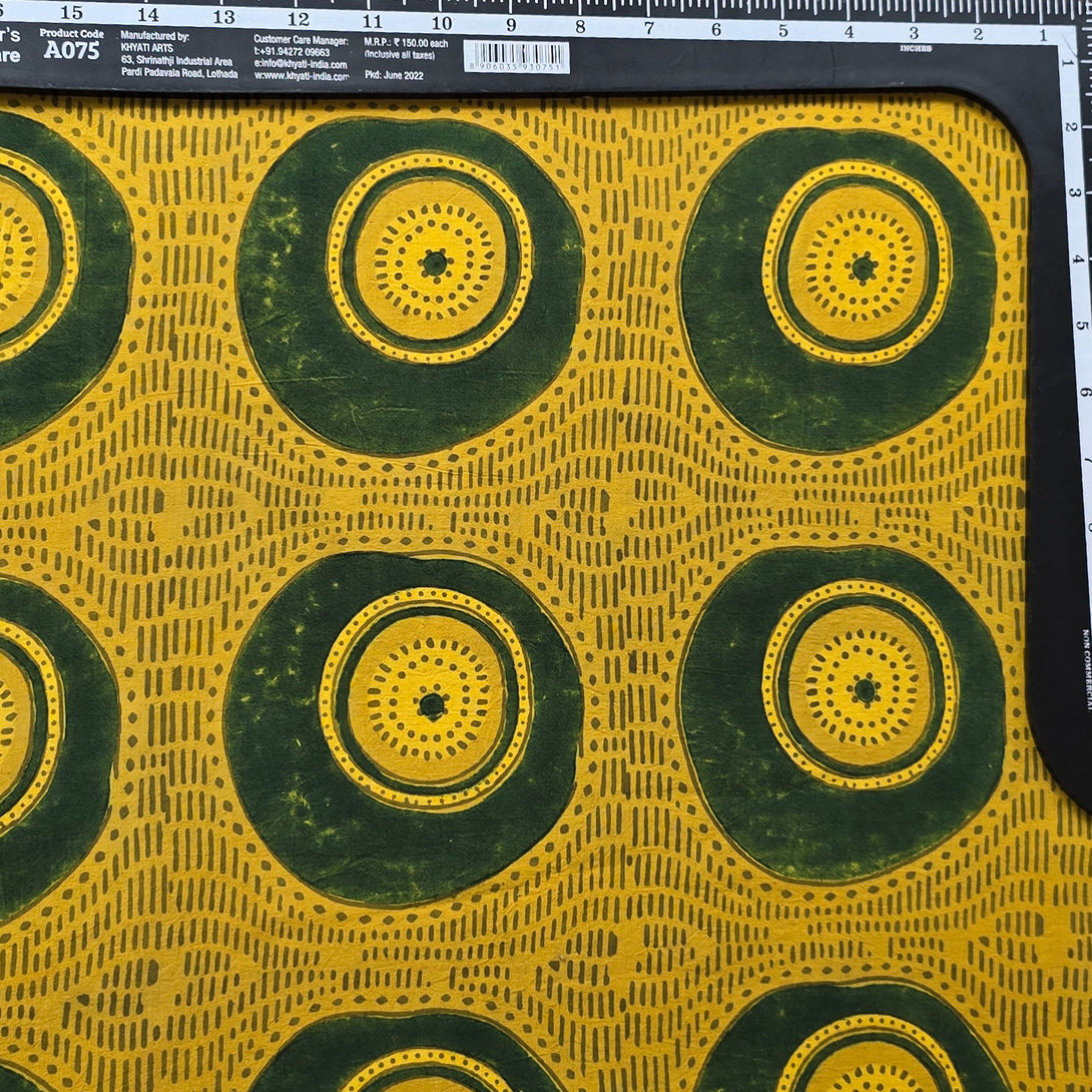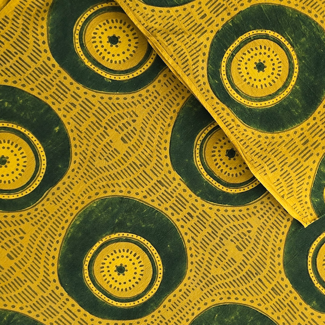 Pure Cotton Gad Ajrak Turmeric With Green Big Circle Intricate Design Hand Block Print Fabric
