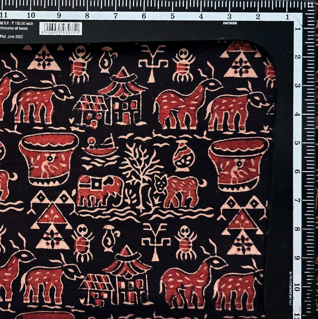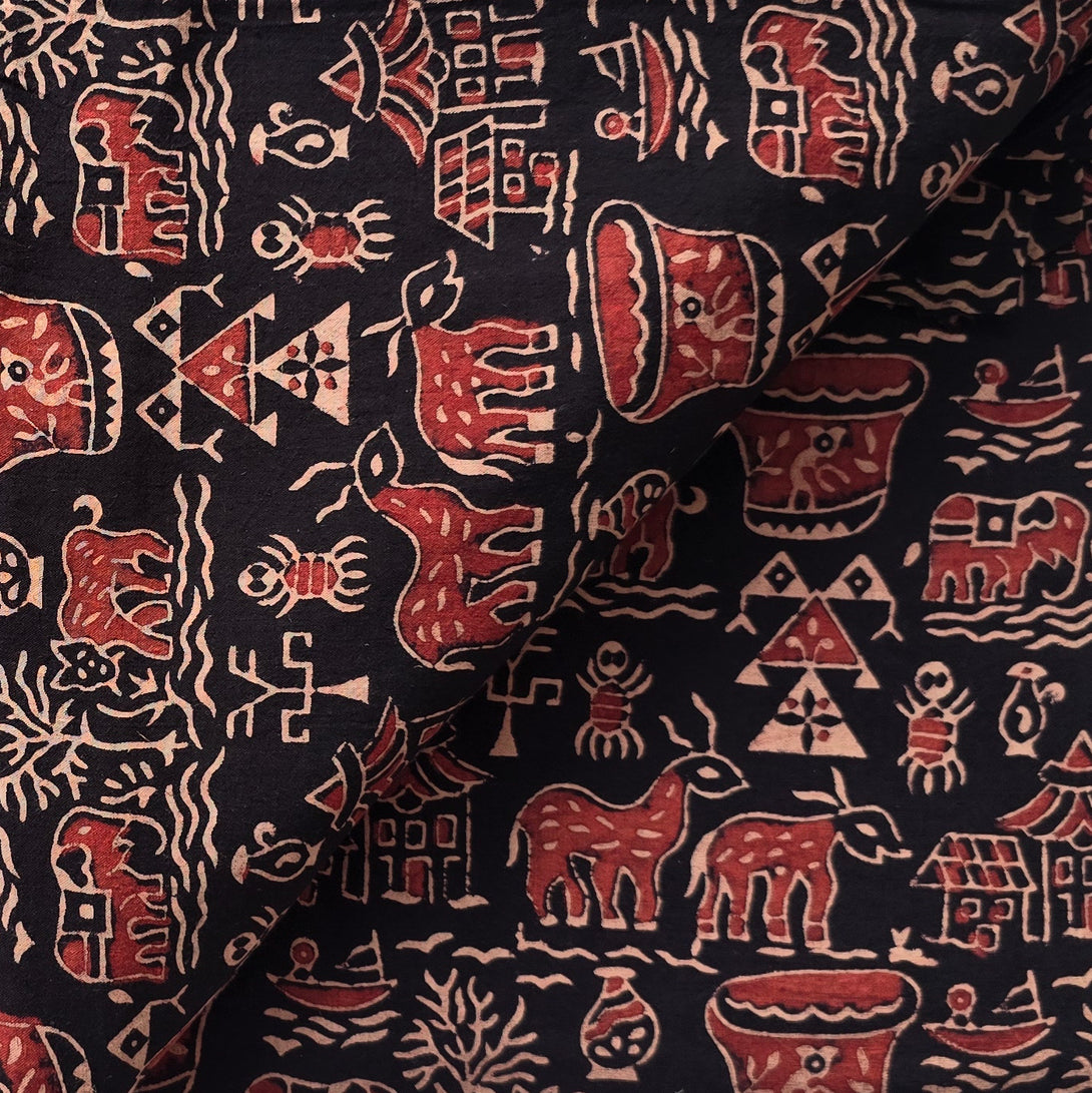 Pure Cotton Ajrak Vegetable Dyed Black And Rust Red With Warli Village Hand Block Print Fabric