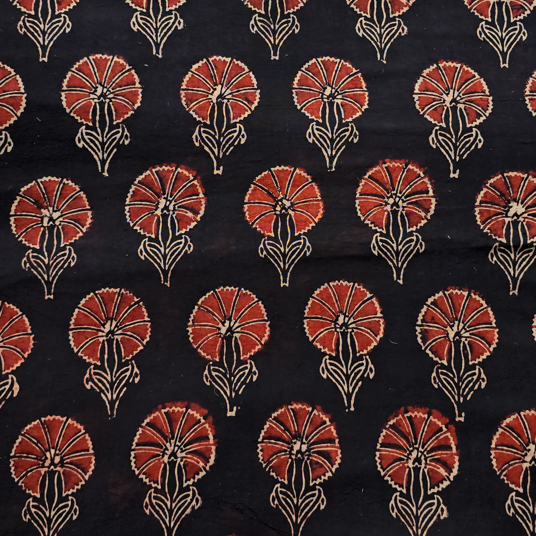 Pure Cotton Ajrak Vegetable Dyed Black With Red Flower Motif Hand Block Print Fabric