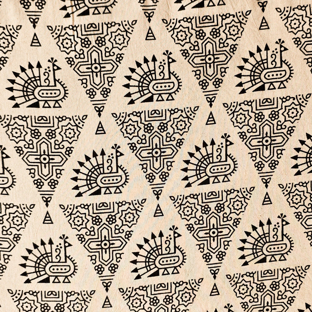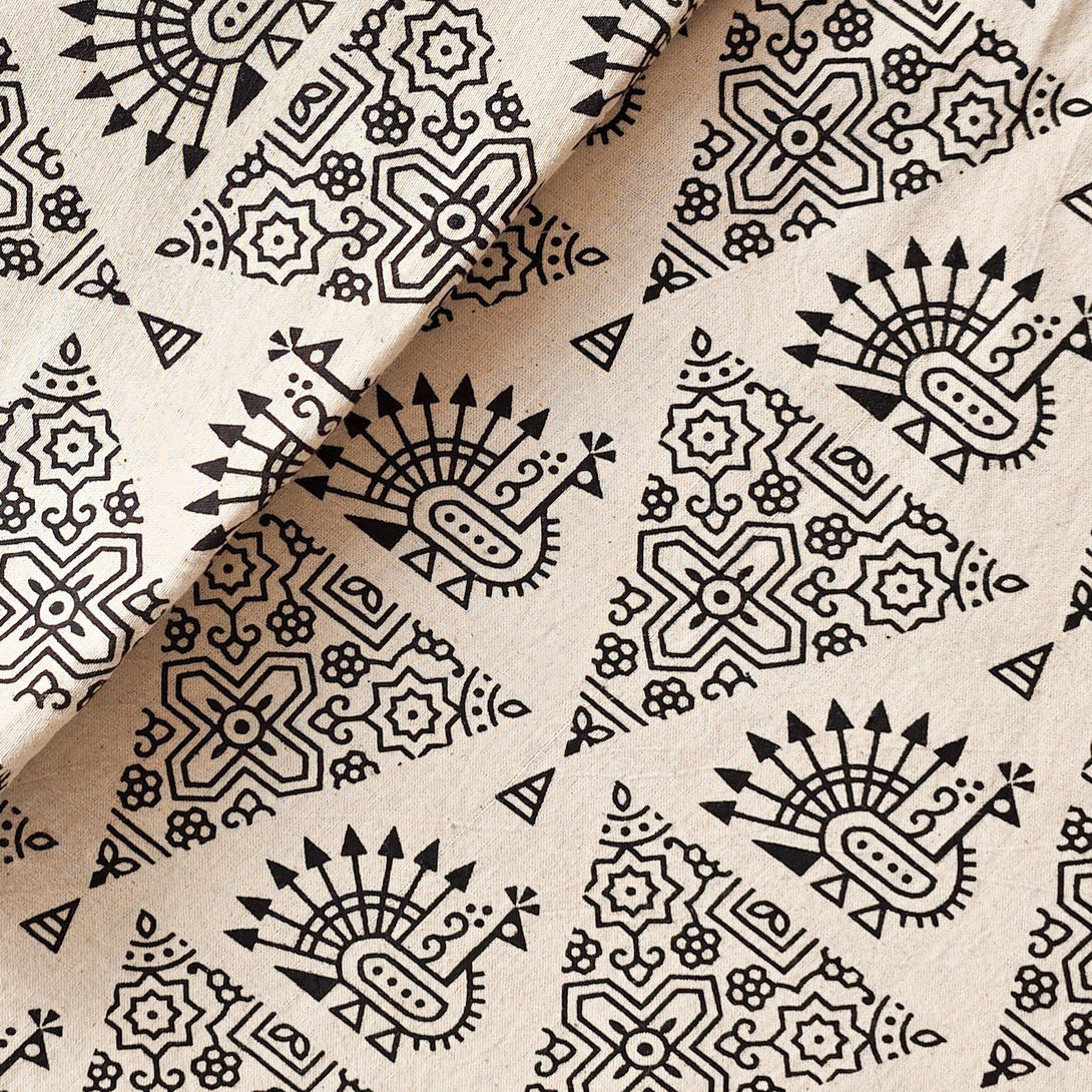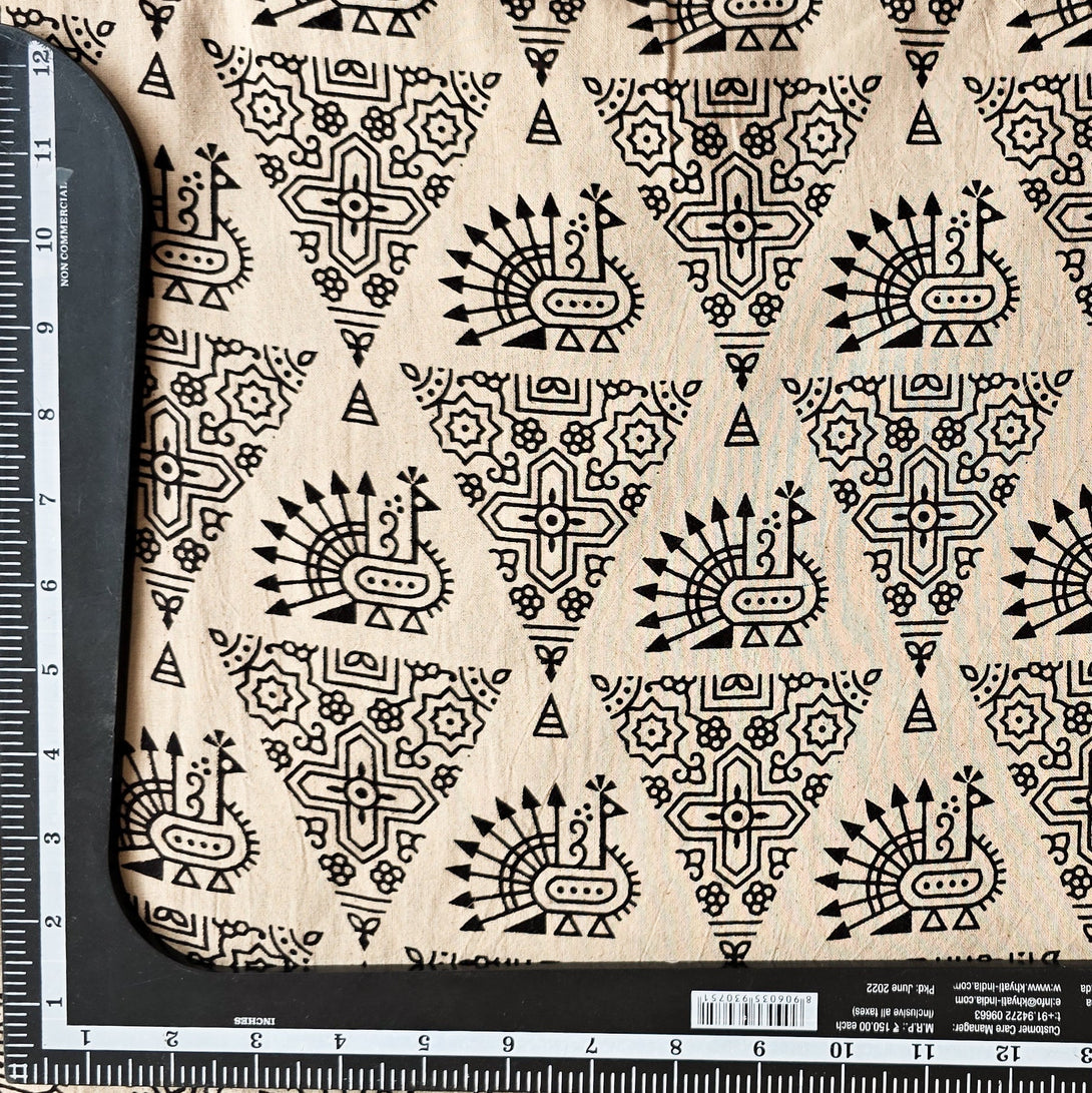 Pure Cotton Ajrak Vegetable Dyed Cream And Black Gemotrical Peacock With Triangle Hand Block Print Fabric
