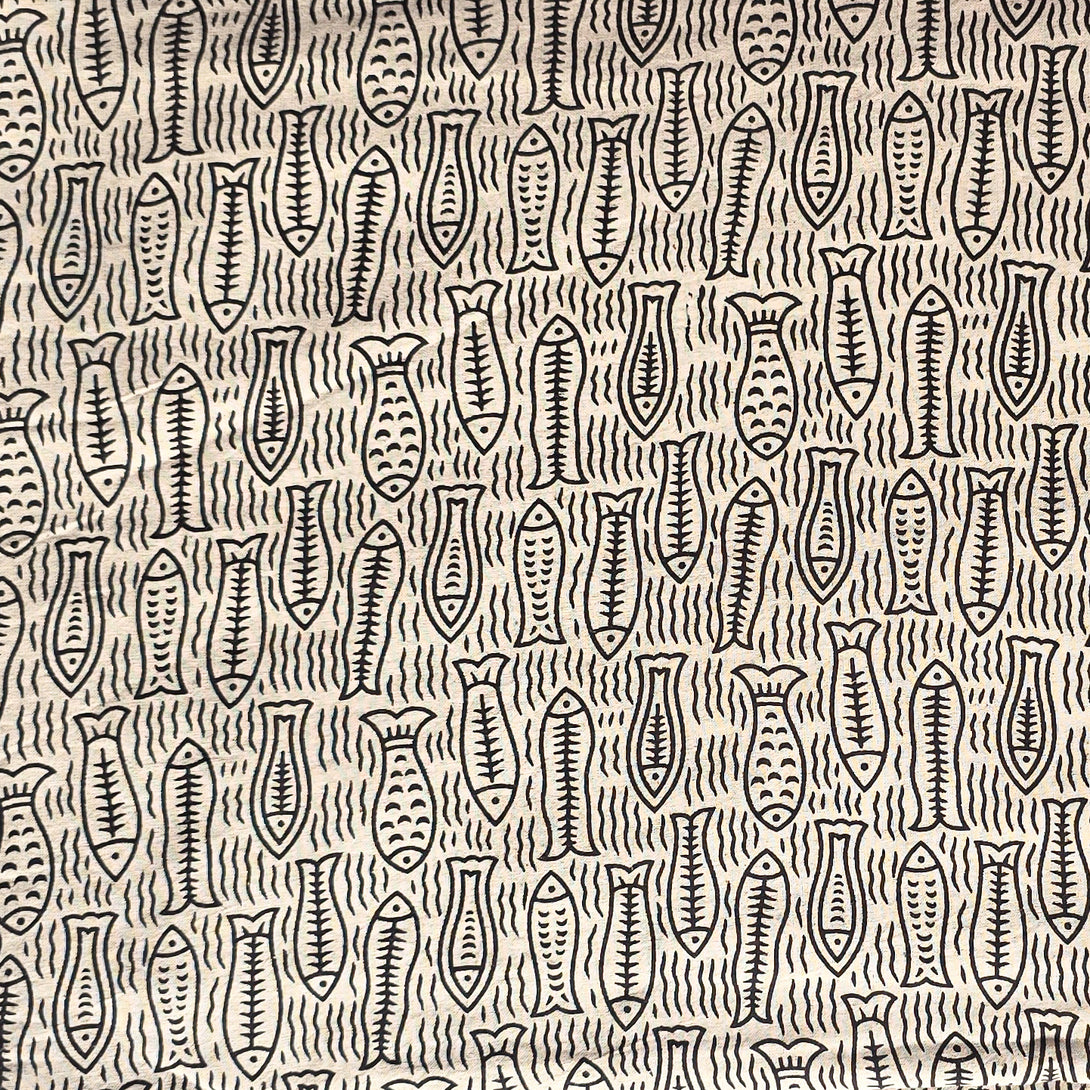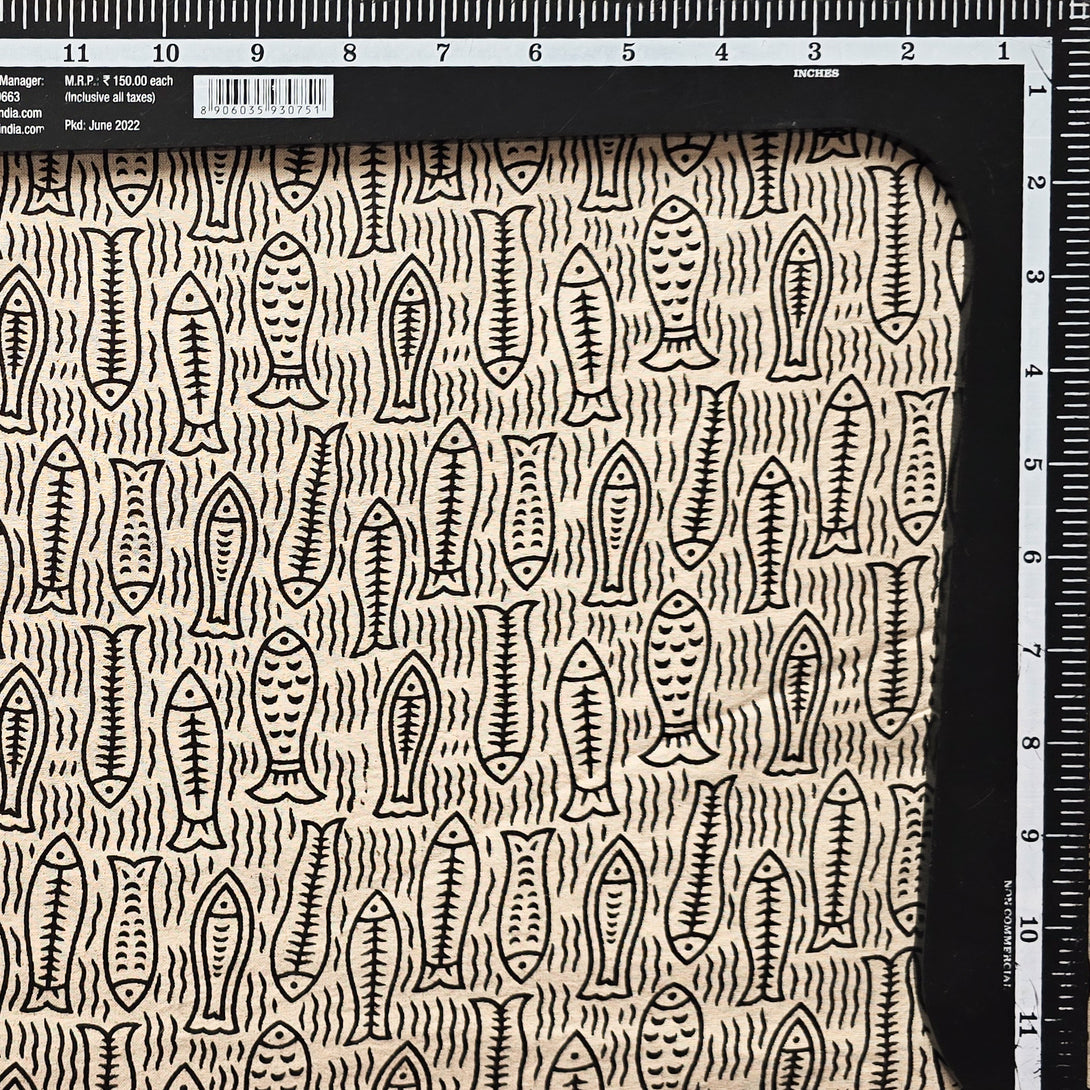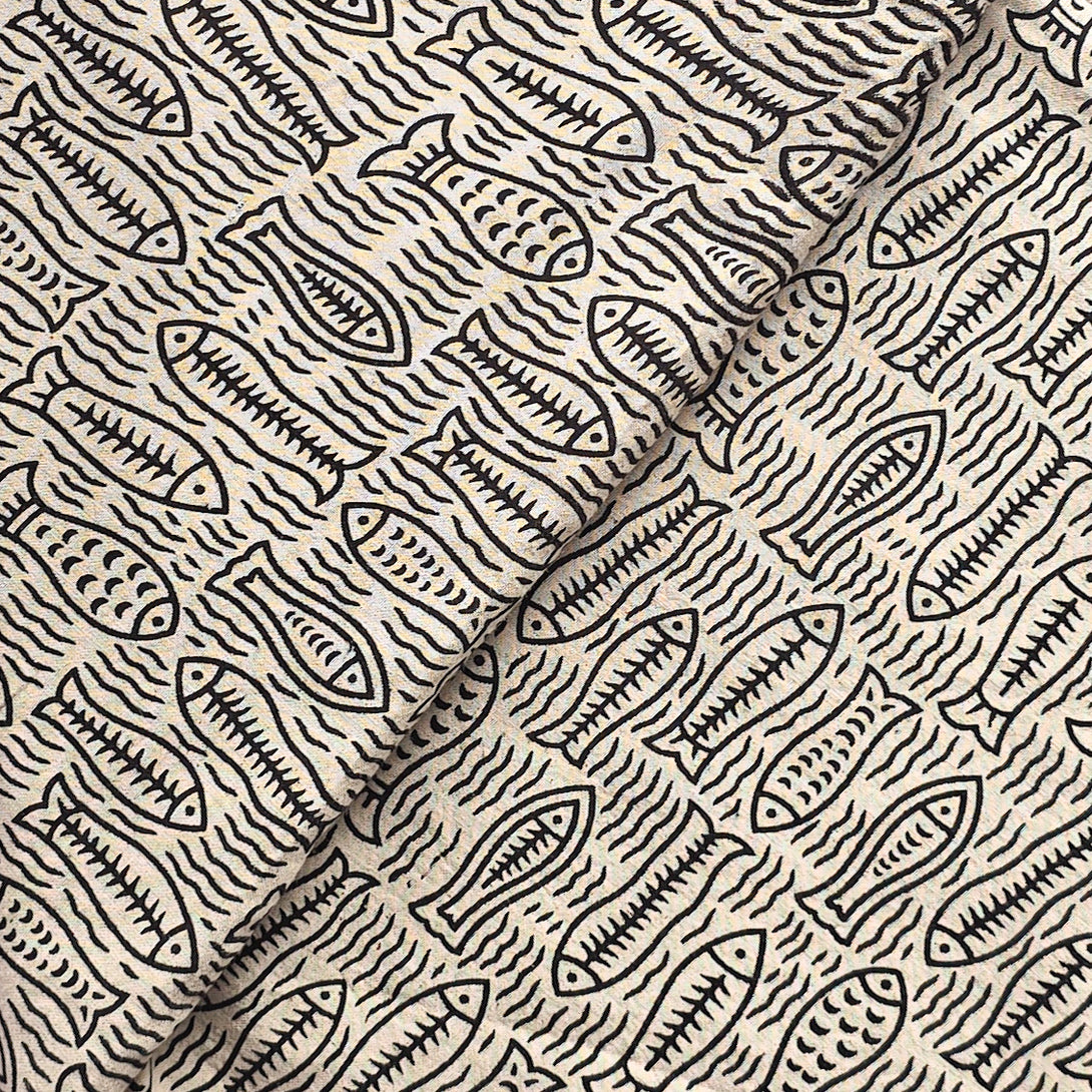 Pure Cotton Ajrak Vegetable Dyed Cream With Black Fish Motif Hand Block Print Fabric