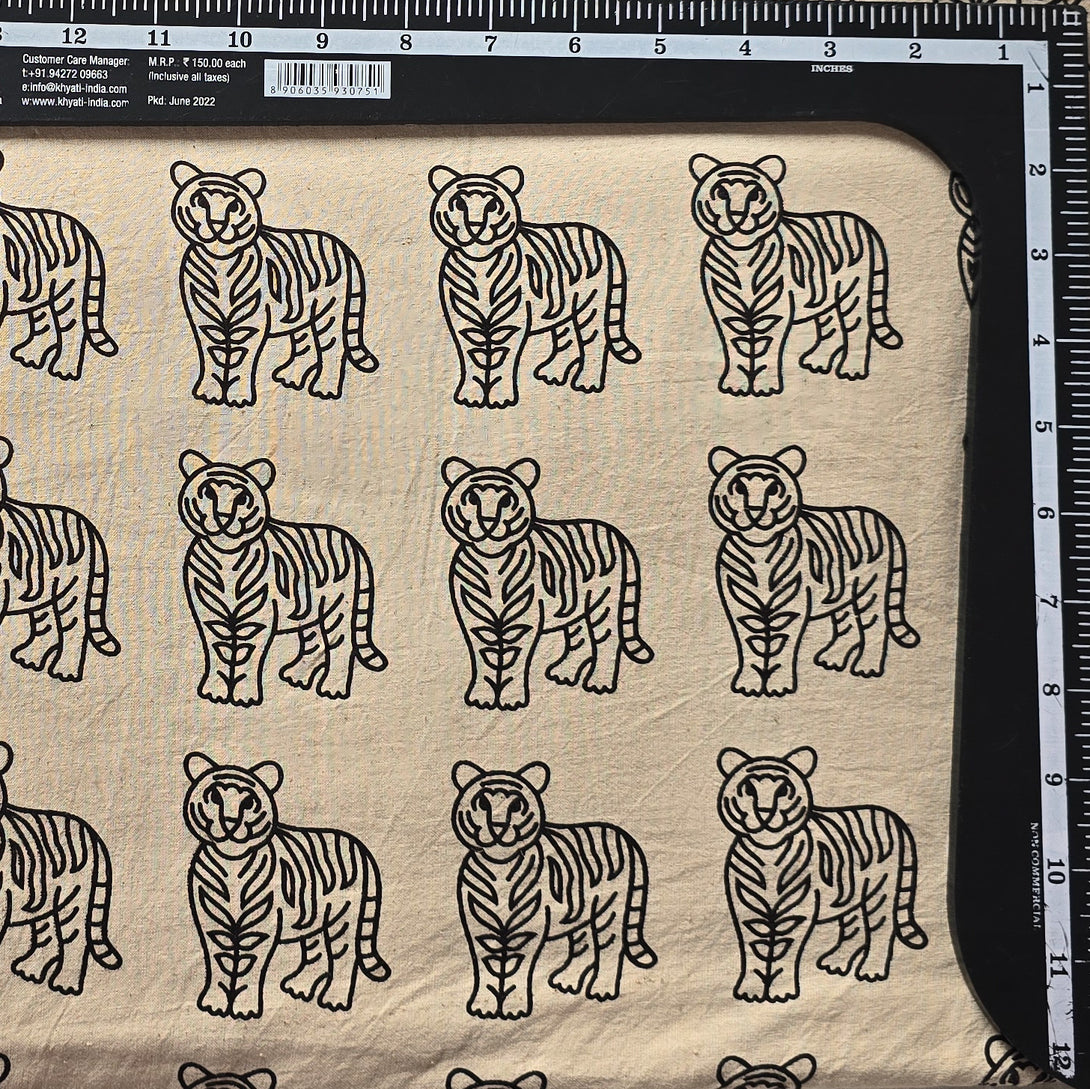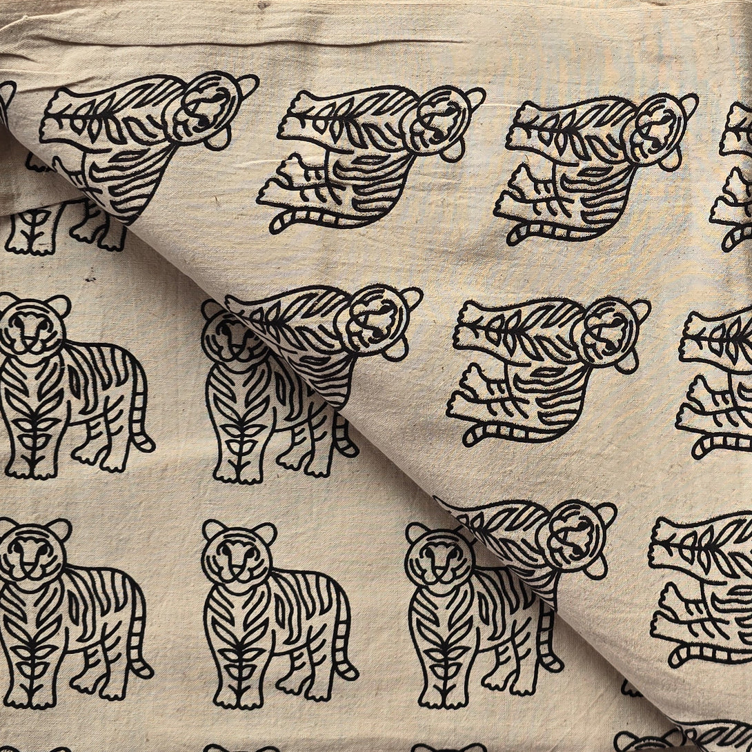 Pure Cotton Ajrak Vegetable Dyed Cream With Black Tiger Motif Hand Block Print Fabric