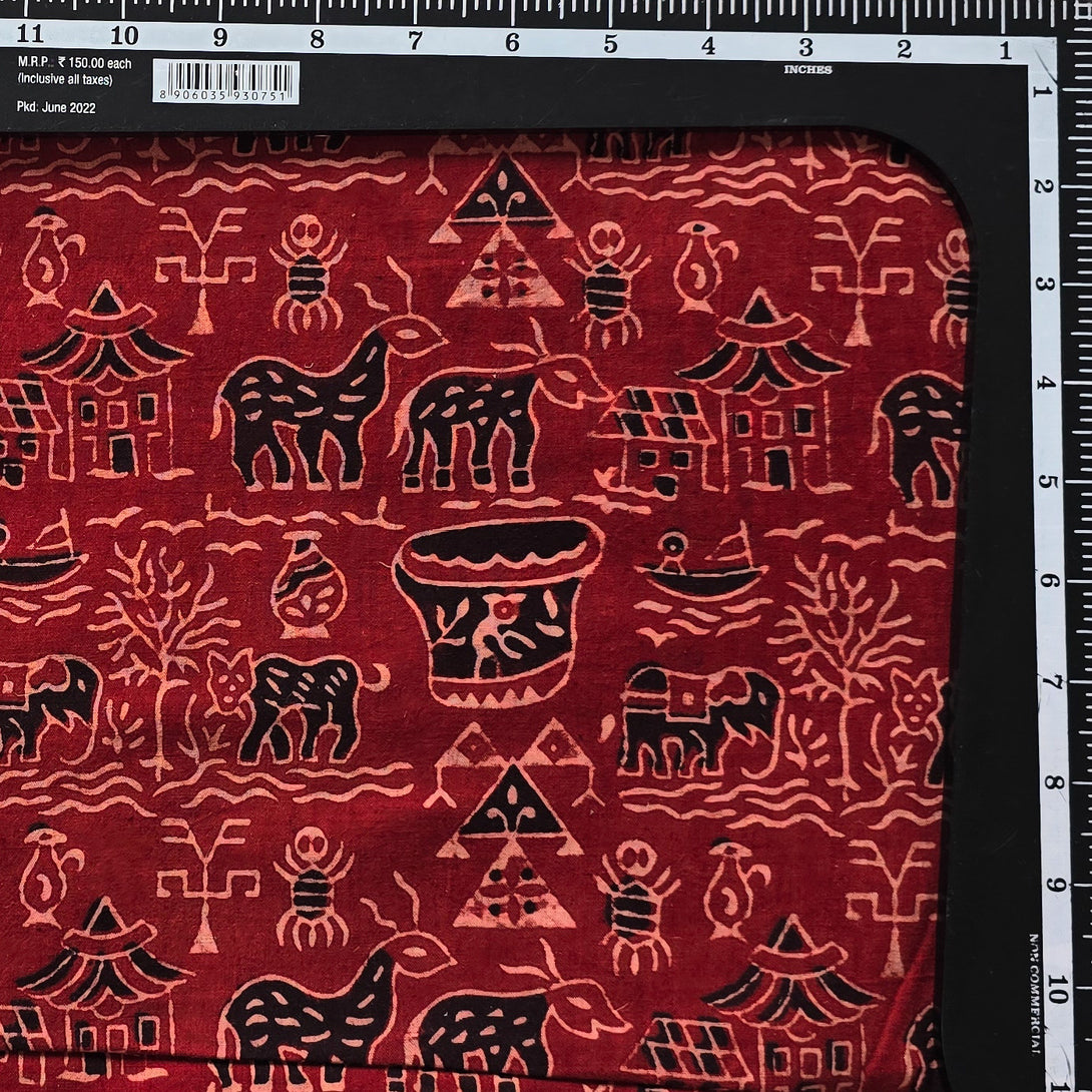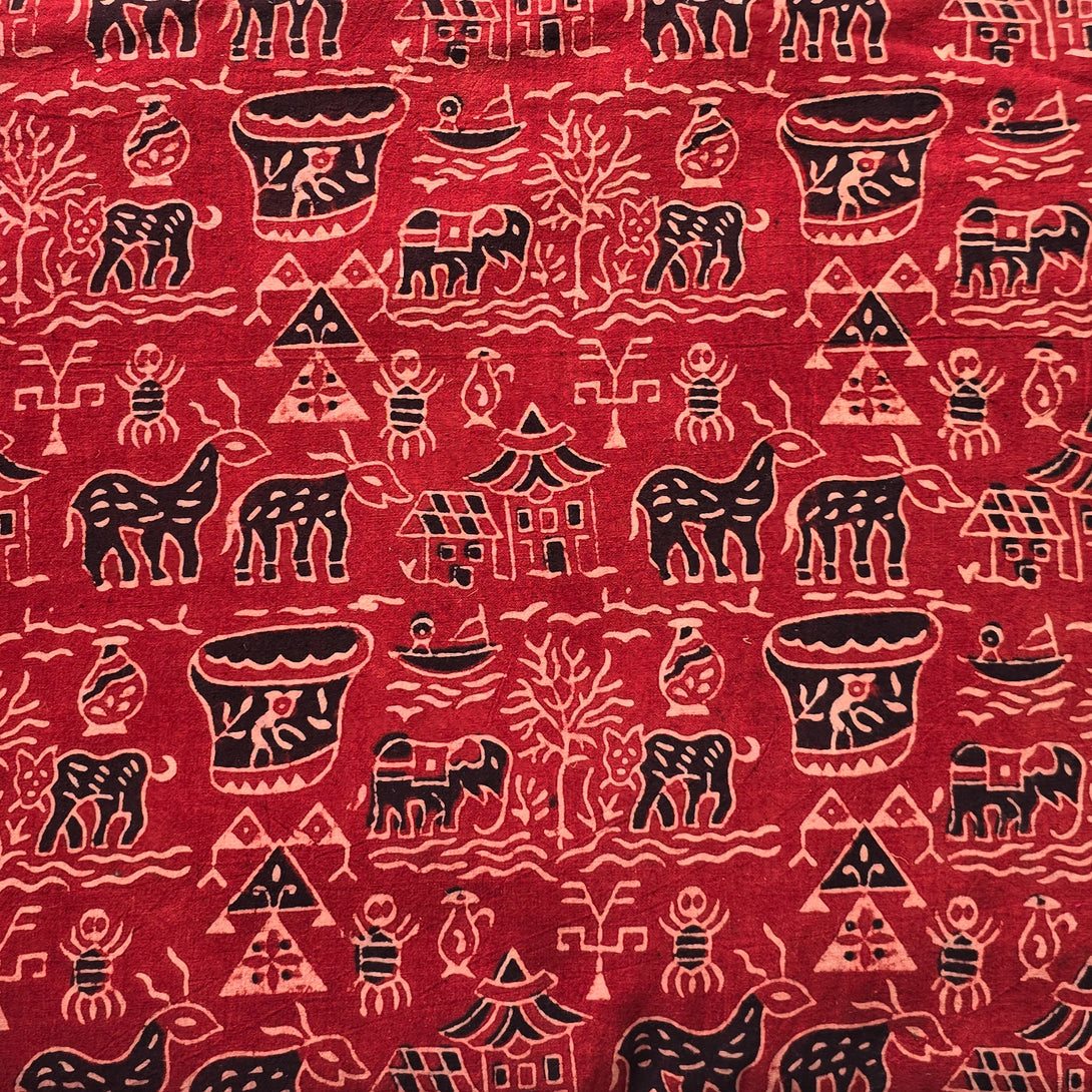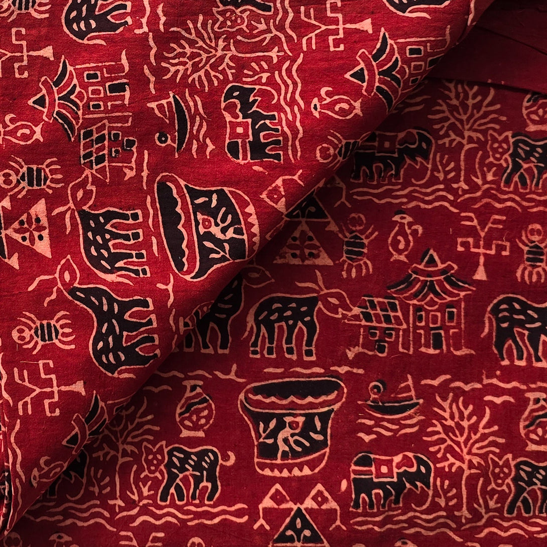 Pure Cotton Ajrak Vegetable Dyed Rust Red With Black Warli Village Hand Block Print Fabric