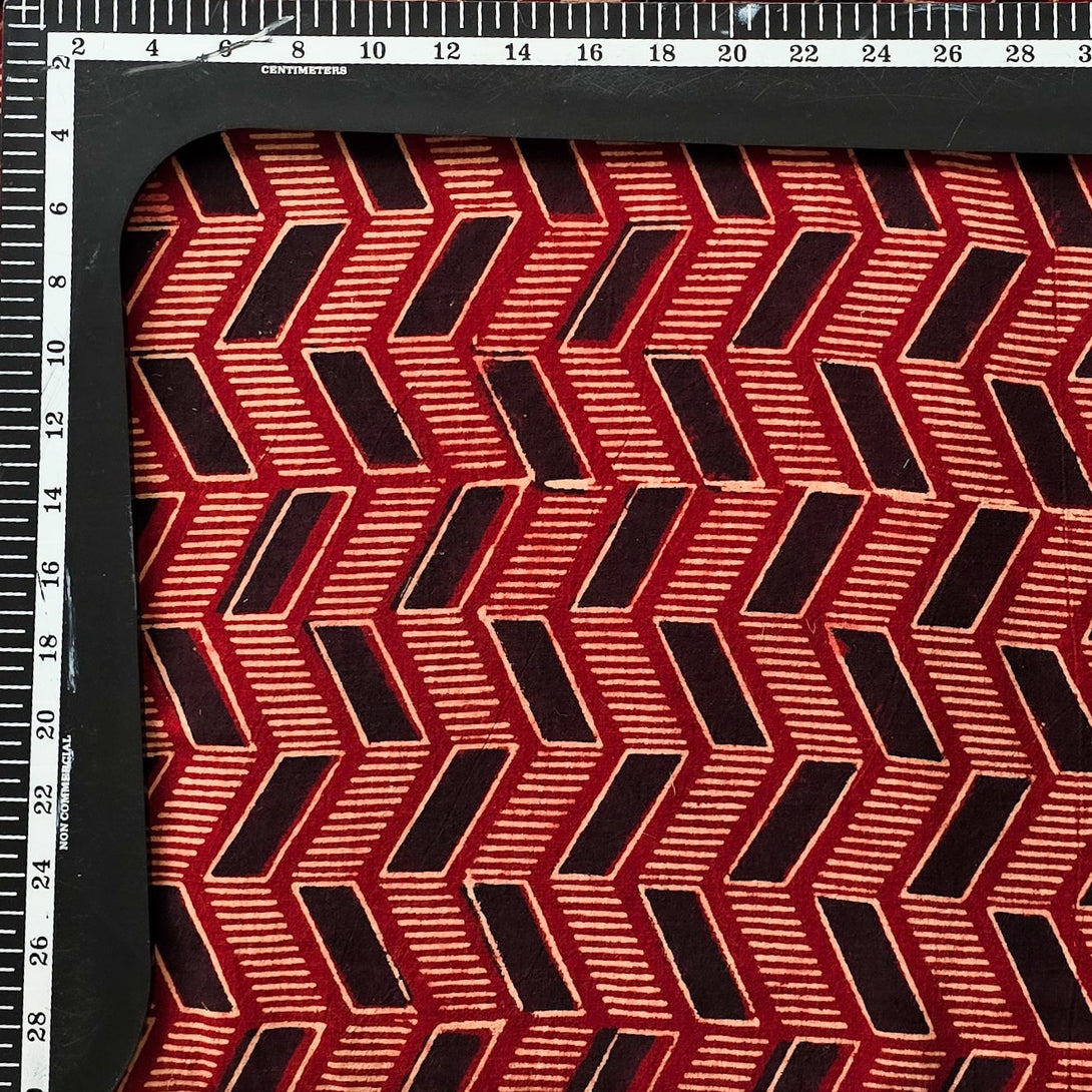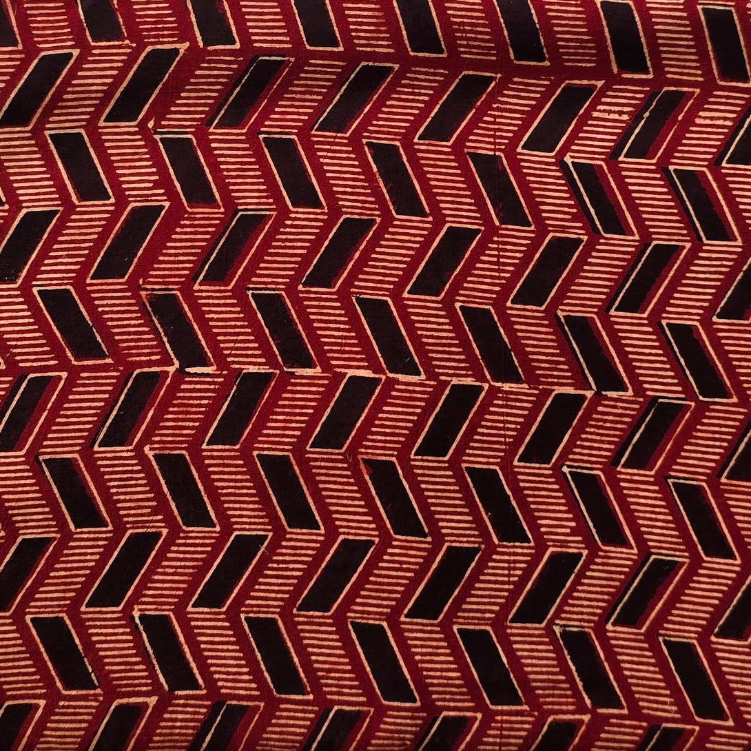 Pure Cotton Ajrak Vegetable Dyed Rust Red With Black Zig-Zag Hand Block Print Fabric