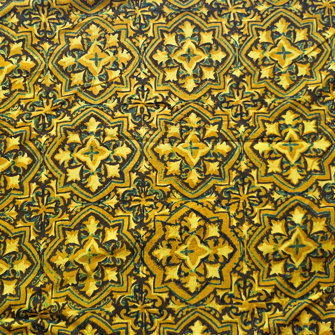 Pure Cotton Ajrak Yellow With Black Intricate Design Hand Block Print Fabric