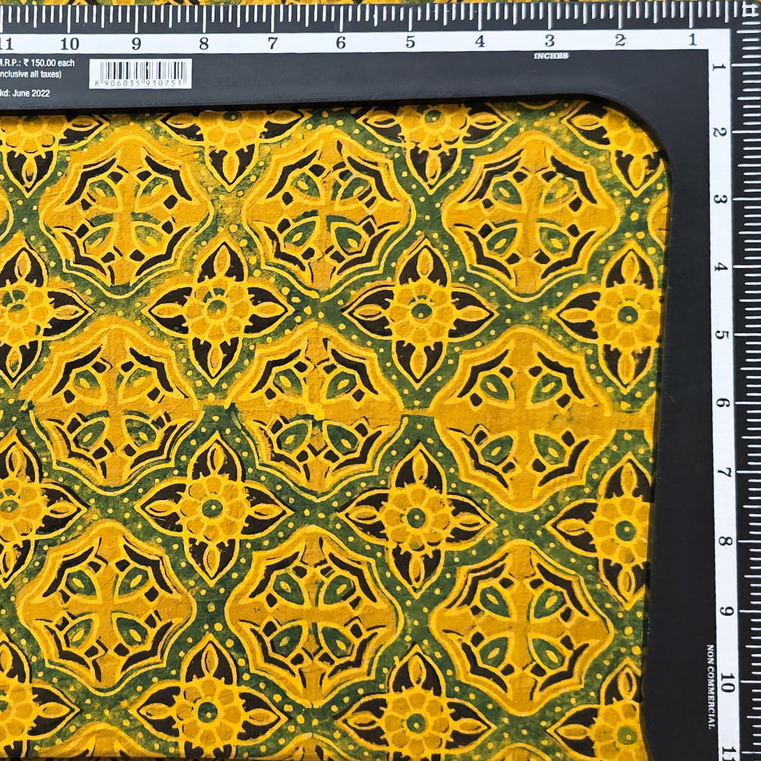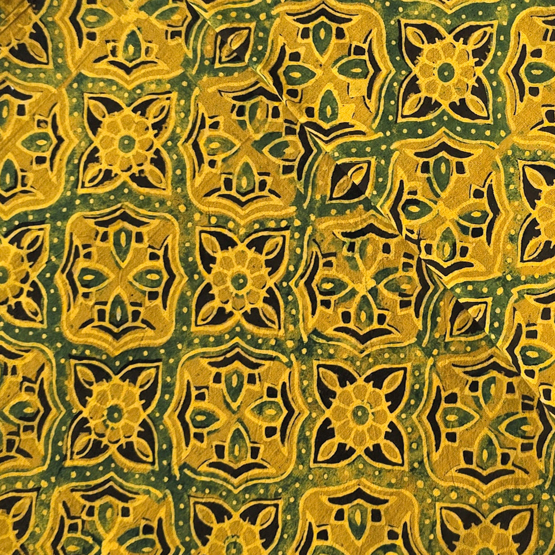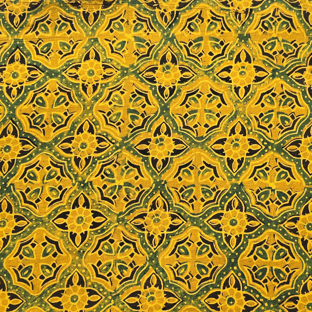 Pure Cotton Ajrak Yellow With Green Intricate Design Hand Block Print Fabric