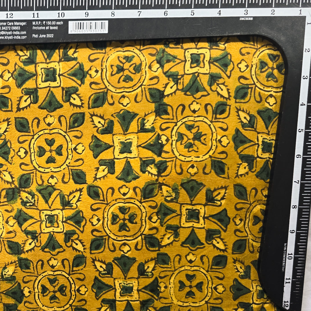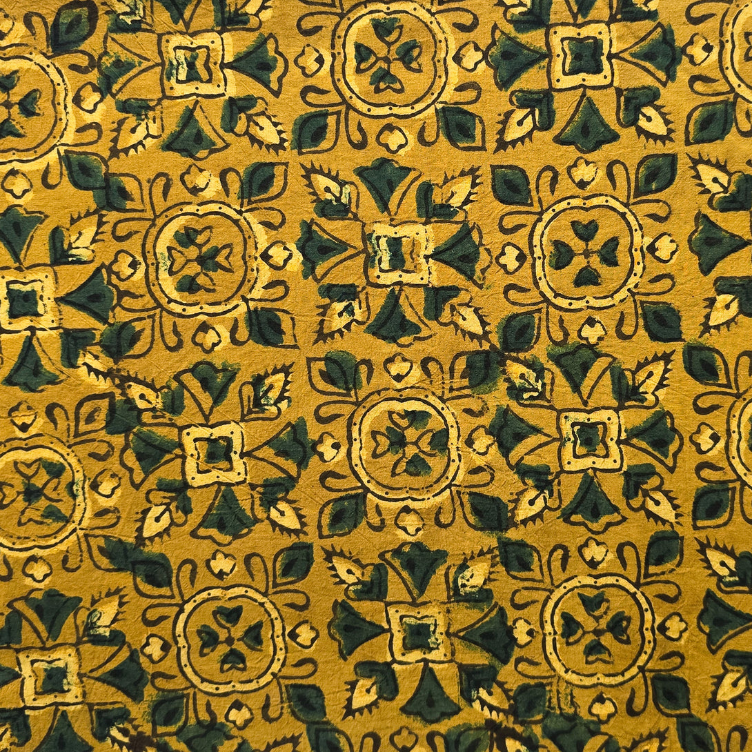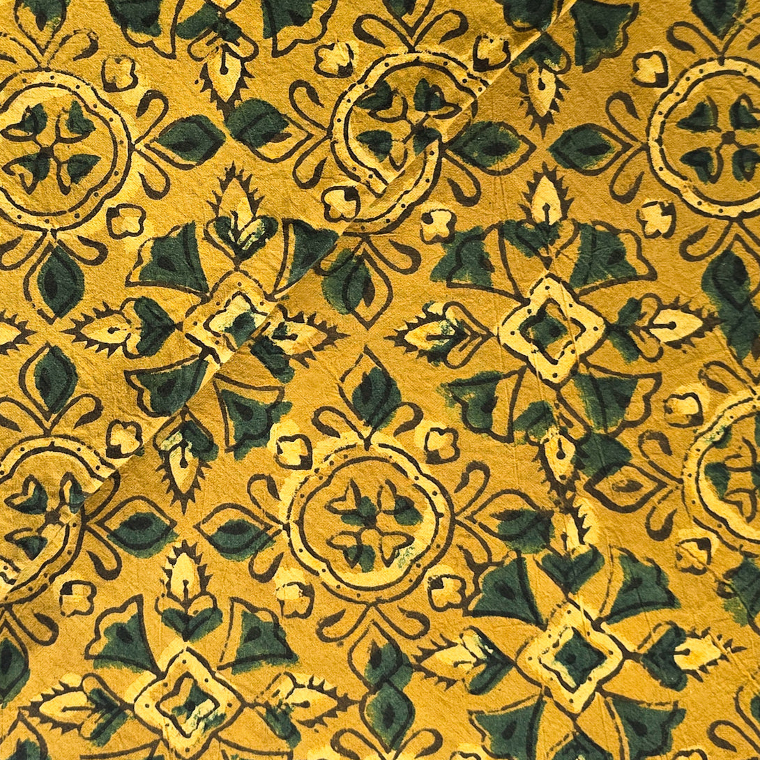 Pure Cotton Ajrak Yellow With Green Intricate Design Motif Hand Block Print Fabric