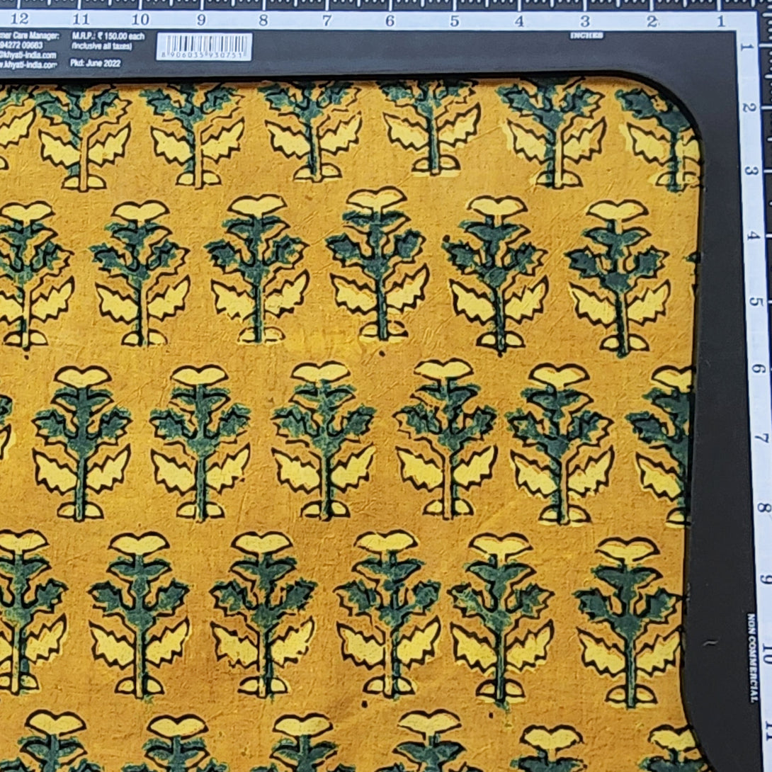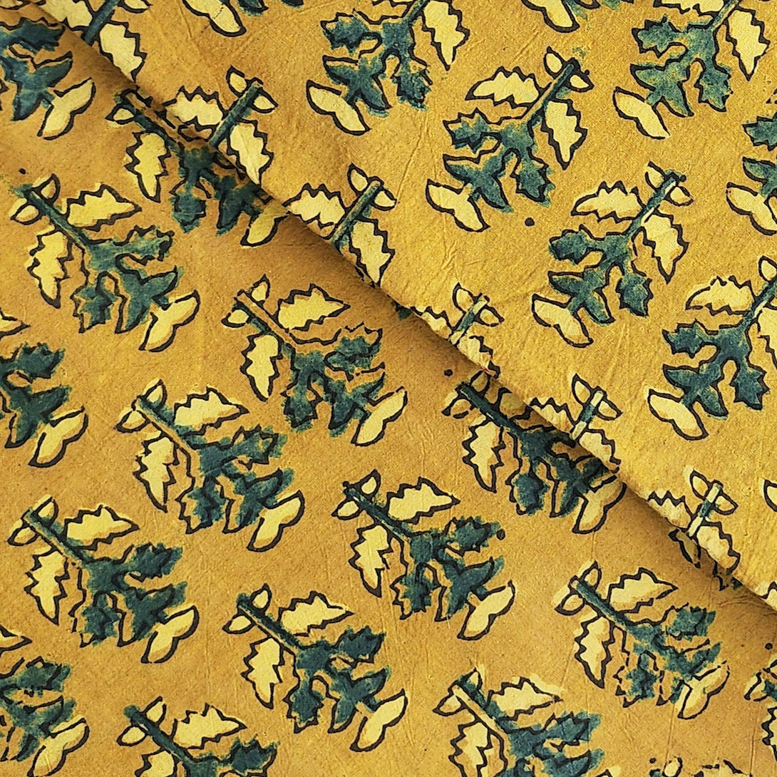 Pure Cotton Ajrak Yellow With Green Motif Hand Block Print Fabric