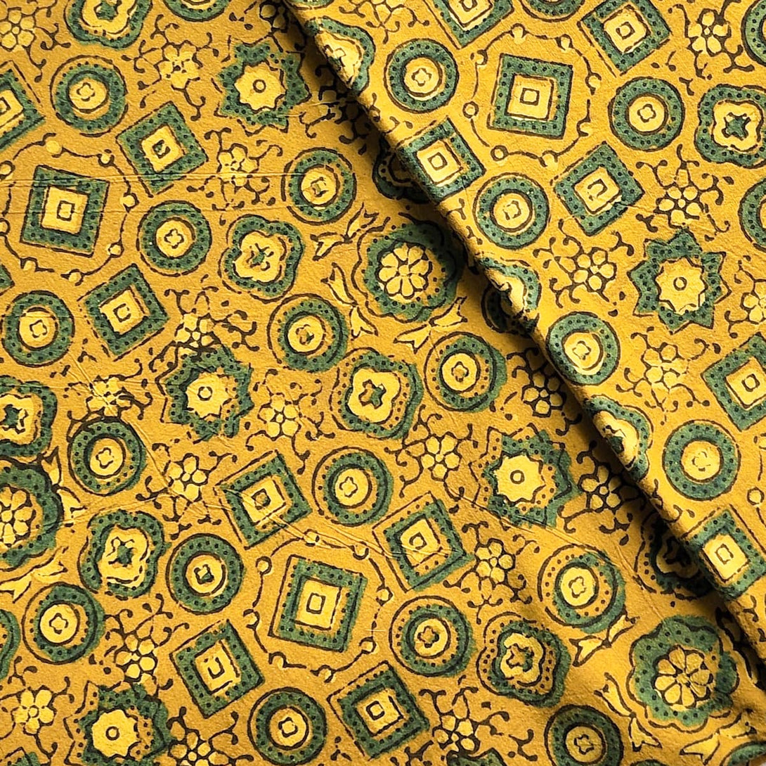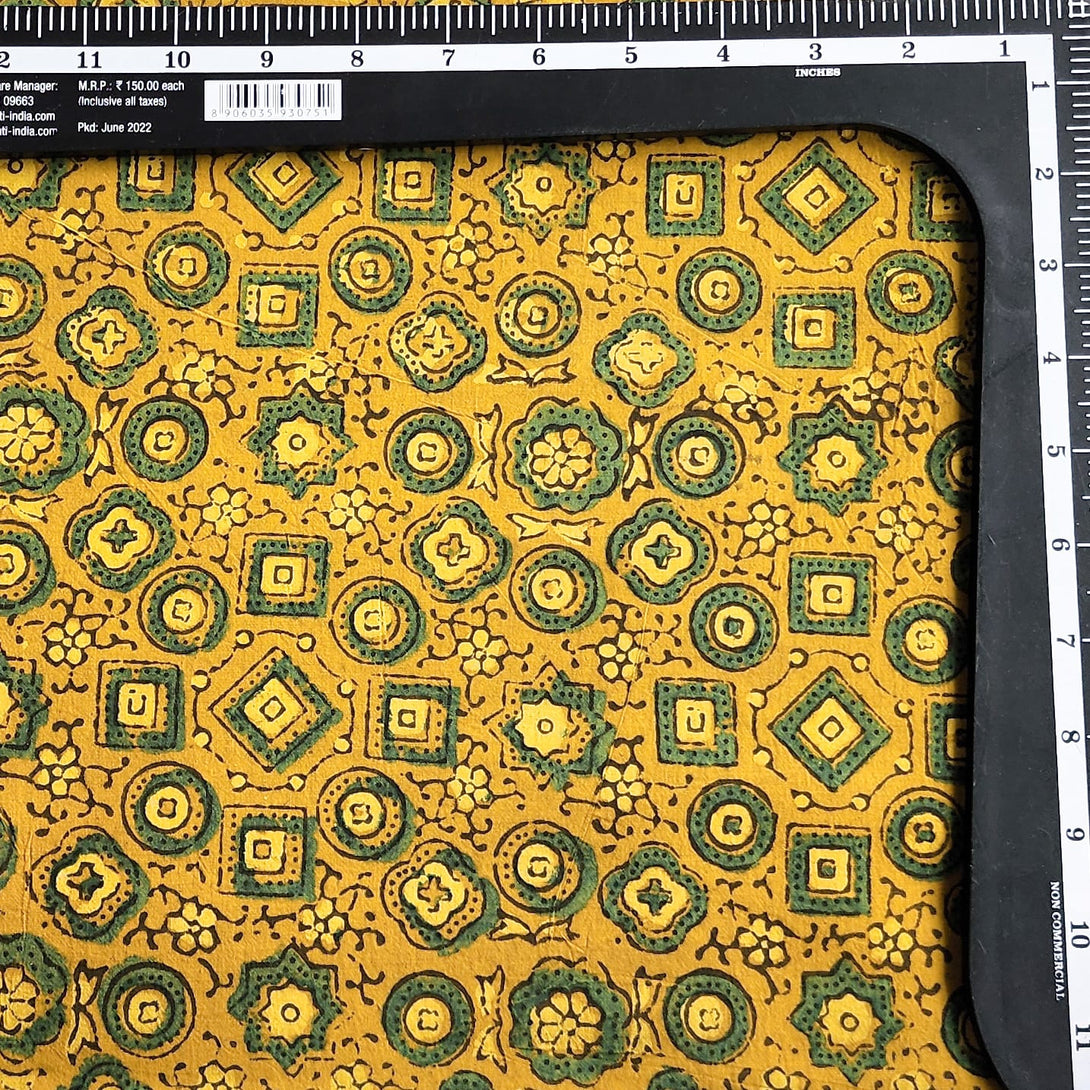 Pure Cotton Ajrak Yellow With Green Square Circle Star Tiles Hand Block Print Fabric