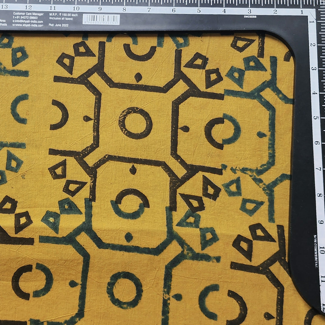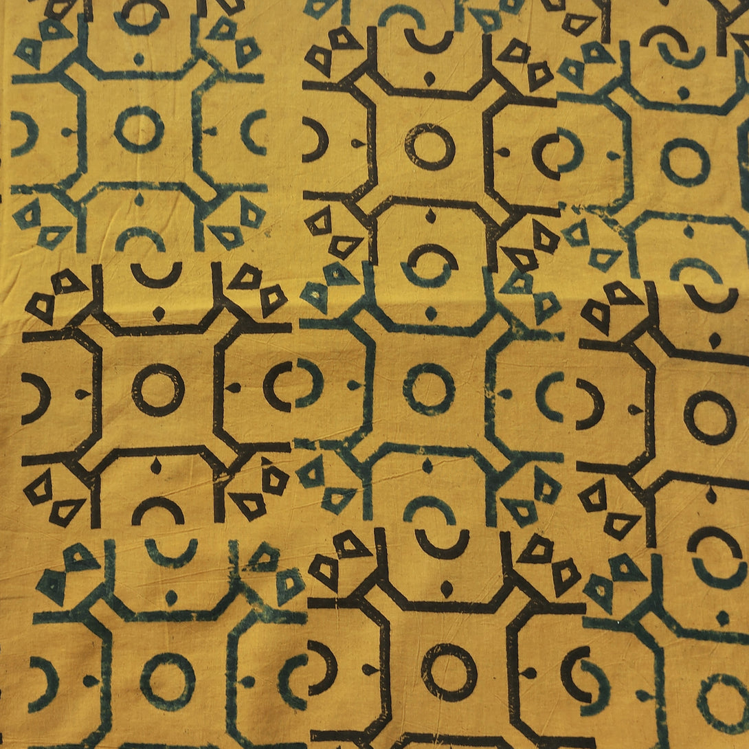 Pure Cotton Ajrak Yellow With Rust Green Geometric Design Hand Block Print Fabric
