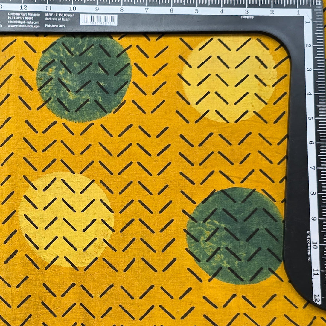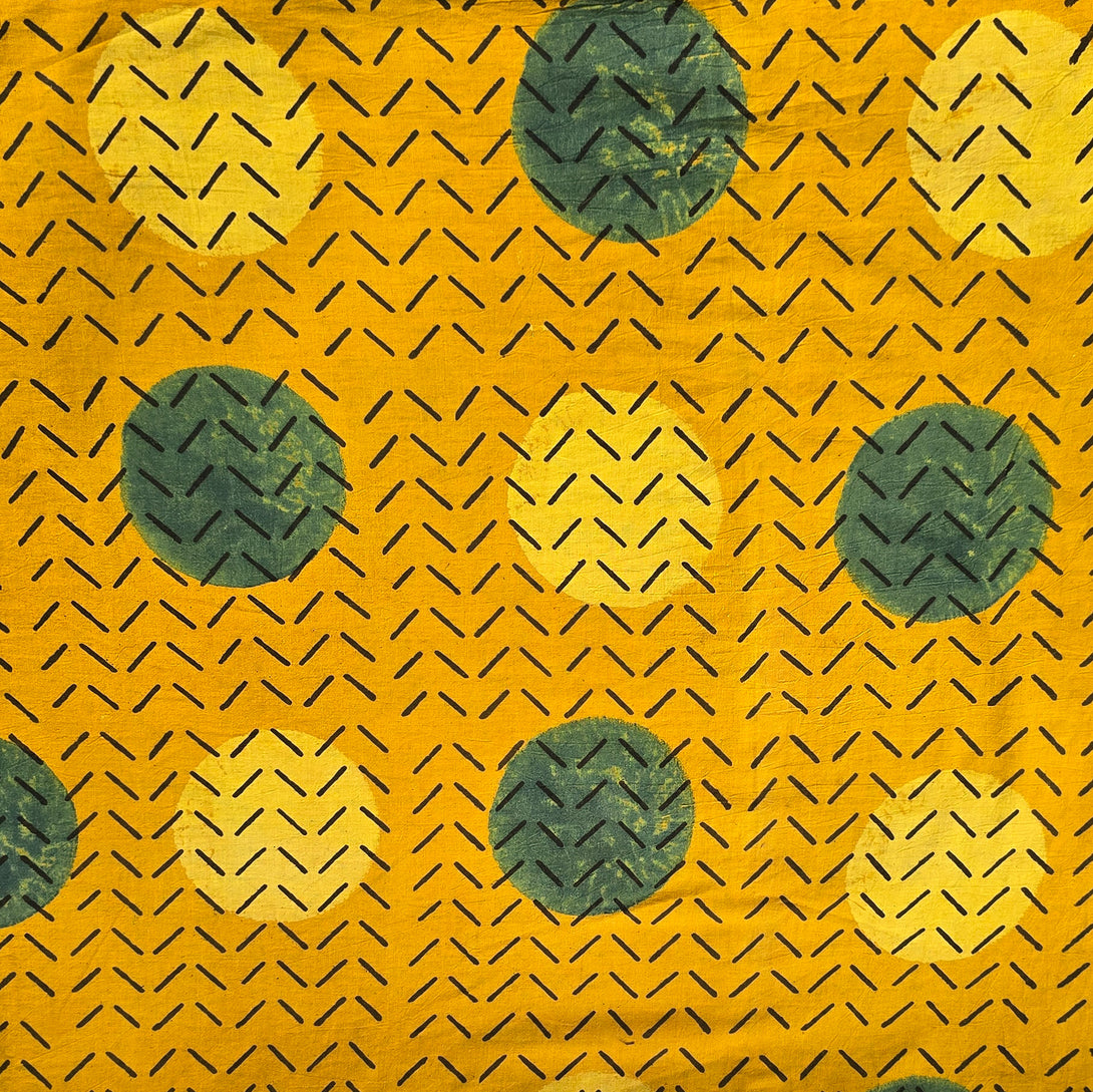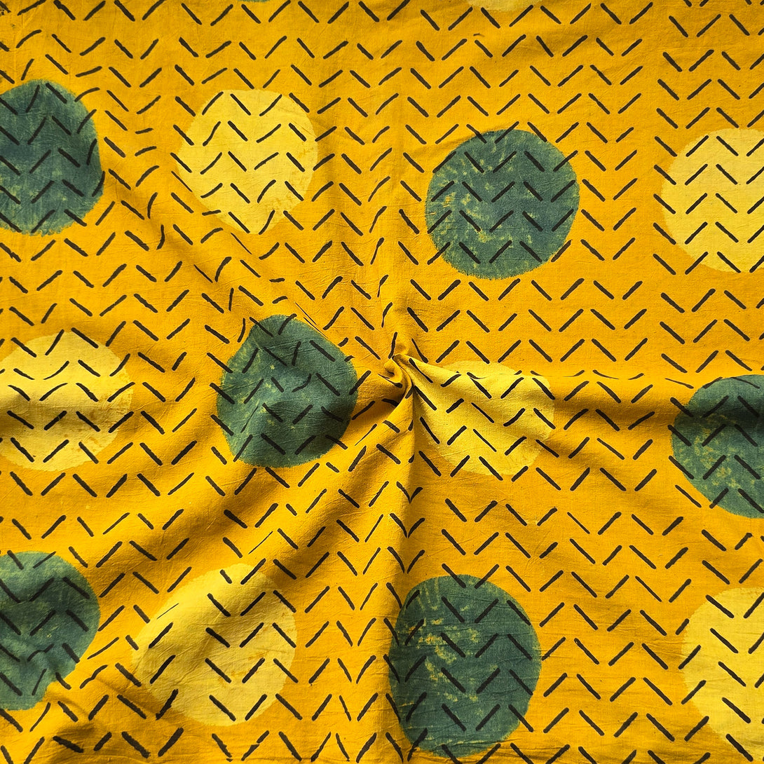 Pure Cotton Ajrak Yellow With Self Design And Big Circle Motif Hand Block Print Fabric