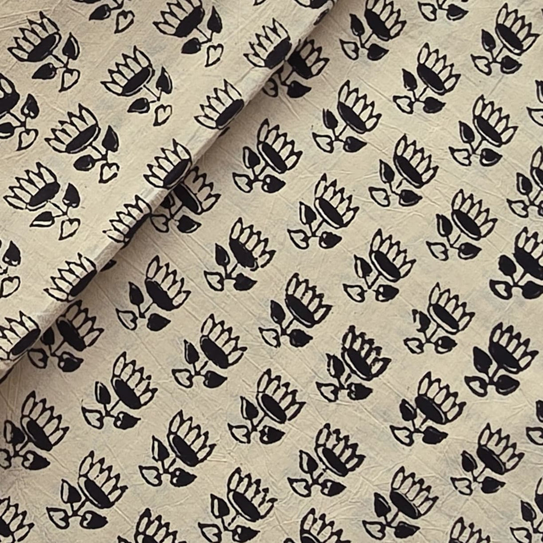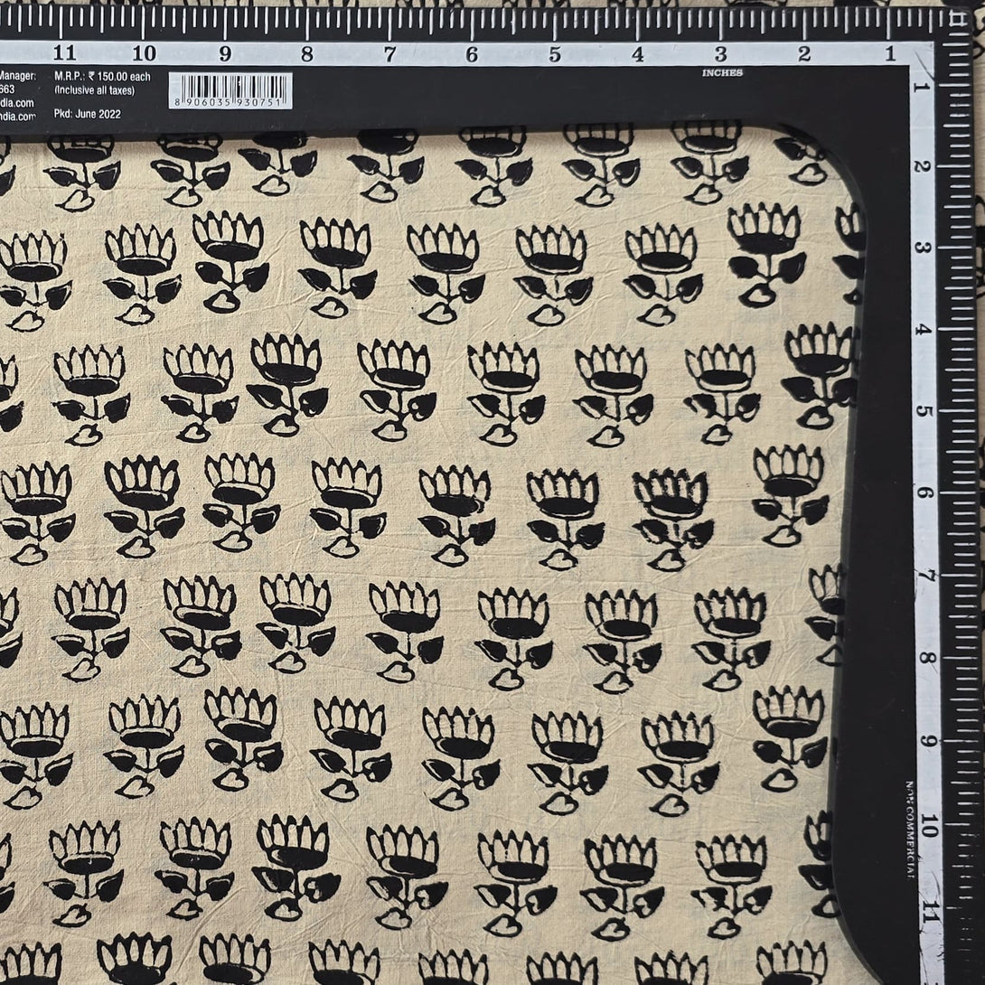 Pure Cotton Bagru Cream With Black Lotus Motif Hand Block Print Fabric