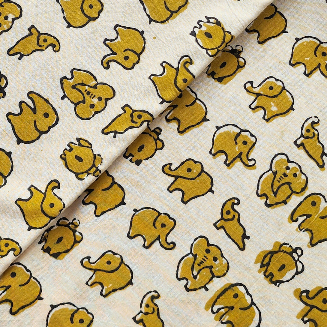 Pure Cotton Bagru Cream With Mustard Cute Elephant Motif Hand Block Print Fabric